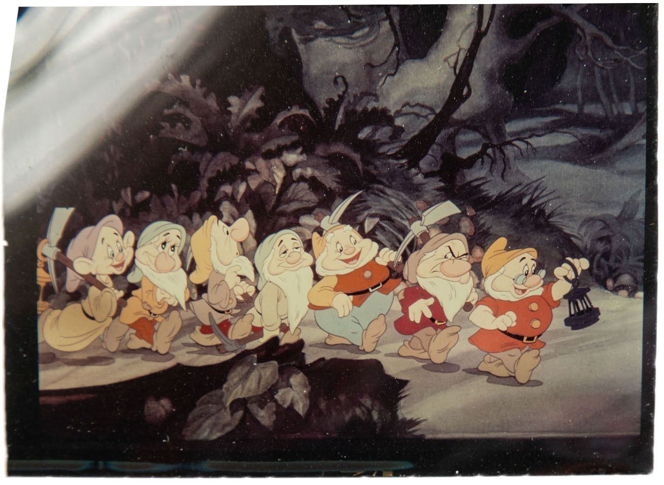(Disney, c. 1937). A rare, vintage press release slide for Walt Disney's "Snow White and the Seven Dwarfs" animated feature film. Images like these were among the first seen by the public prior to the release of the film. The slide is in good condition with normal wear from age and use.