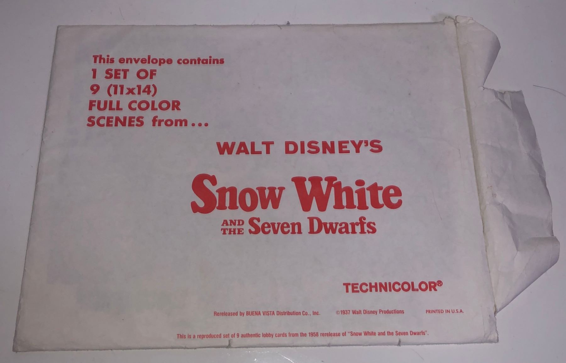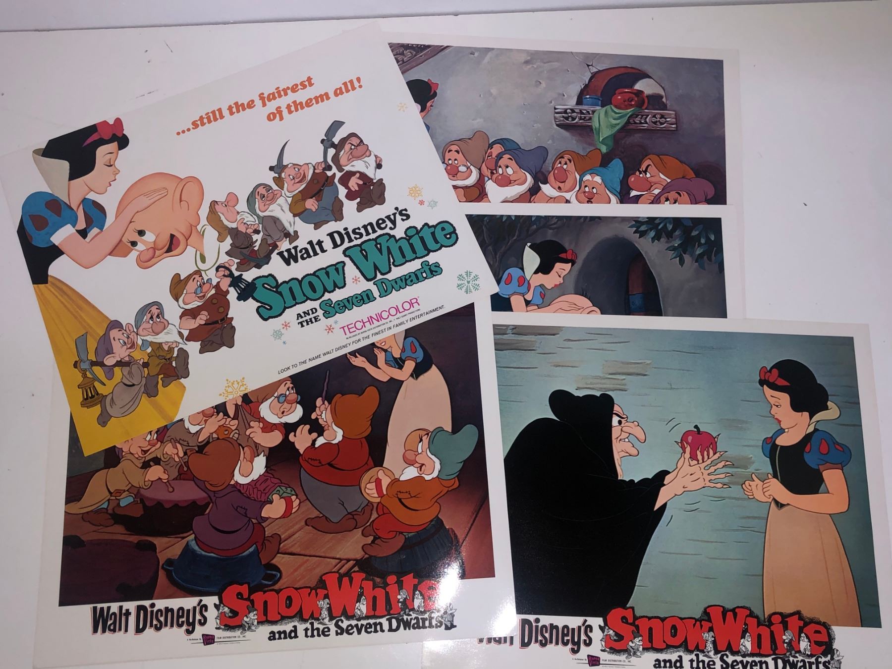 (Disney, c. 1967) A complete set of 9 Walt Disney's Snow White and the Seven Dwarfs lobby cards used for the film's 1967 re-release into theaters. The lobby cards display exciting scenes from the film and are in good condition with normal wear from age and handling. Each lobby card measures approximately 14.25" x 11.25" (without the frame). Three lobby cards are framed and ready for display. Nine total lobby cards including the original envelope. The envelope is a 1958 re-release, however the 1958 re-release lobby cards would not have had a tittle card with Snow White and Animals sweeping the floor, which would make these the 1964 re-release. Thank You to an expert for helping us out with identifying these. Hopefully this helps other collectors as well. Item comes with a Grand Circle Tour Auctions COA.