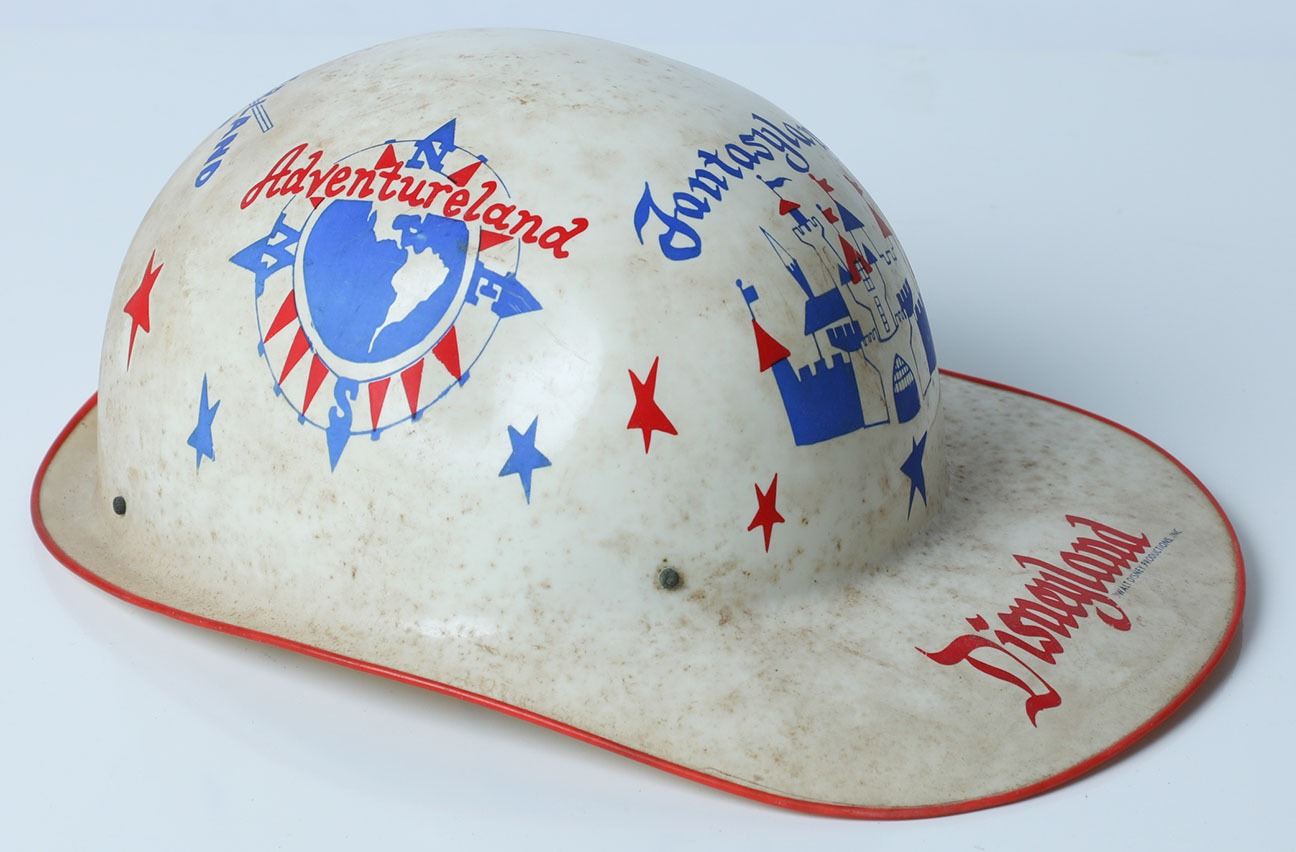 (Disneyland, c. 1950's-60's).A vintage Disneyland Keppy Kap hat souvenir of the park. The hat has beautiful and early artwork for the lands of Tomorrowland, Frontierland, Adventureland and Fantasyland, including the Sleeping Beauty Castle. The hat is in good condition with normal wear from age and use, including some discoloration and spotting around the hat.