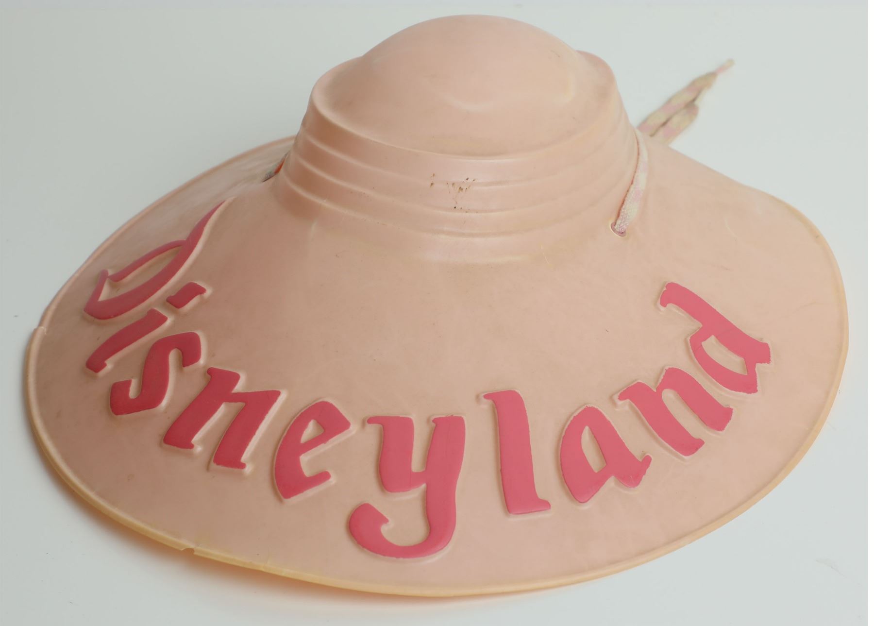 (Disneyland, c. 1950's-60's). A vintage Disneyland sun hat souvenir. Few of these hats have survived and in this good of condition. The sun hat is in a light pink tone with "Disneyland" scrolled across the visor. The sun hat has normal wear from age and use, including some cracks.