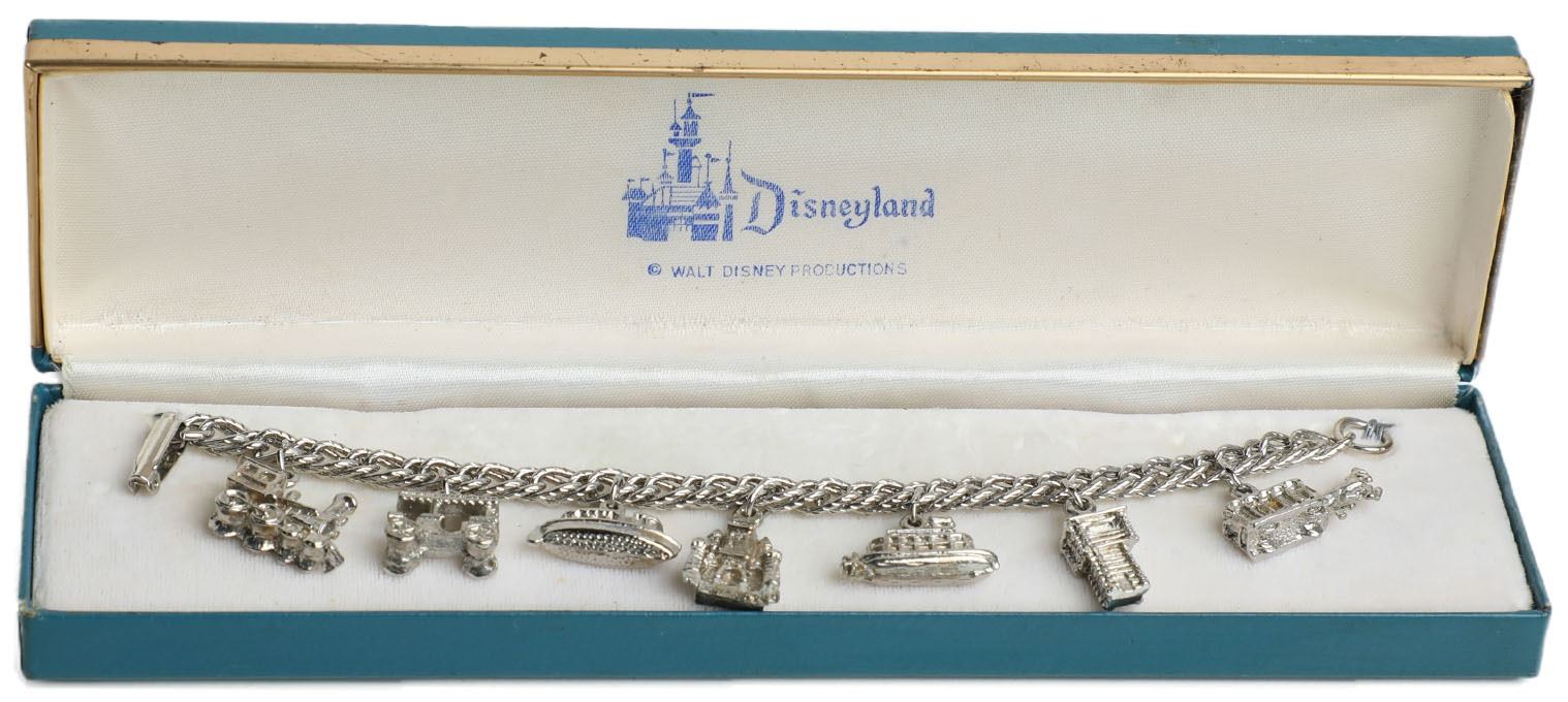 (Disneyland, c. 1950's). A very rare, vintage Disneyland charm bracelet sold inside the park in the 1950's. The bracelet has charms that highlight lands and attractions of the park like the Disneyland Train, Sleeping Beauty Castle, Mark Twain Riverboat and more. The bracelet is in good condition with normal wear from age and minimal use and comes in its original display box.