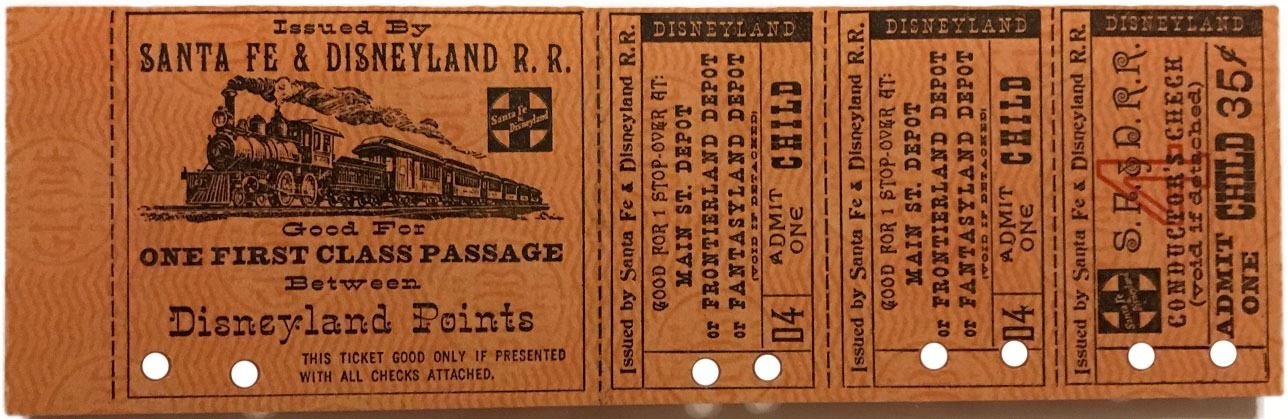 (Disneyland, c. 1955). A very rare "Santa Fe & Disneyland R.R." ticket with the child admission stub still attached. While it's rare to find these tickets, it's extremely rare to find them with the admission stub still attached. The ticket measures approximately 8" x 2.5" and is in very good condition with normal wear from age and minimal handling.