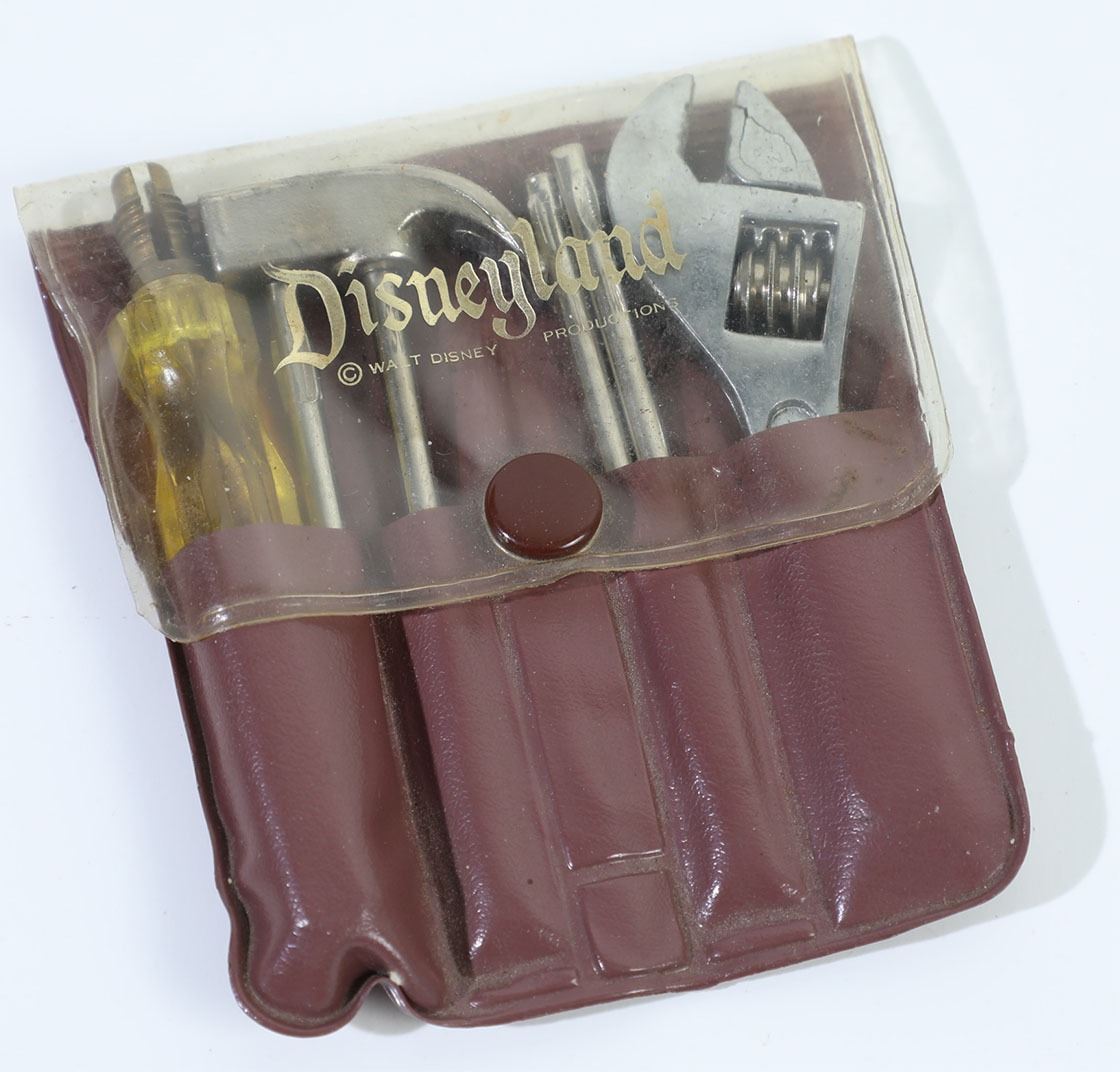(Disneyland, c. 1950's). A very rare, vintage Disneyland tool set that includes a small hammer, wrench and screwdriver with interchangeable heads. The tools and display pouch are in good condition with normal wear from age and use.