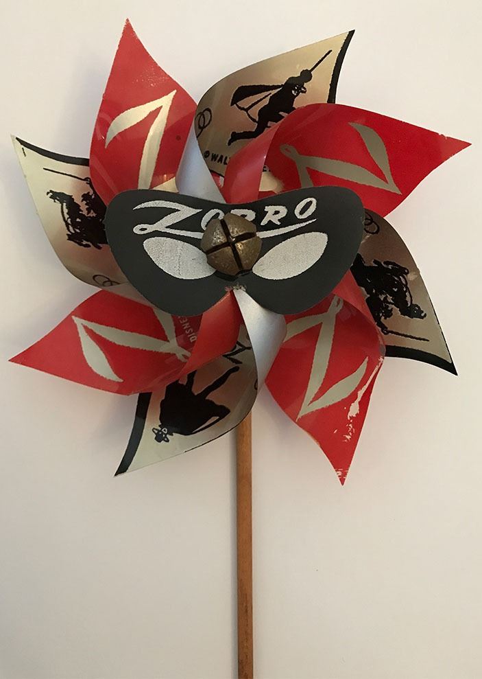 (Disneyland, c. 1950's). Walt Disney's "Zorro" premiered in 1957 as an action-adventure western series on ABC. Shortly after its premiere, the first Disneyland park souvenirs for Zorro began to appear. Offered here is one of the earliest of such souvenirs, a Disneyland Zorro pinwheel with original bell and Zorro mask still attached, and mounted on its original stick handle. The feathers of the pinwheel alternate between silver Zorro "Z" on red and artwork of the character Zorro in action. The pinwheel is in very good condition with normal wear from age and use. Item comes with a Grand Circle Tour Auctions COA.