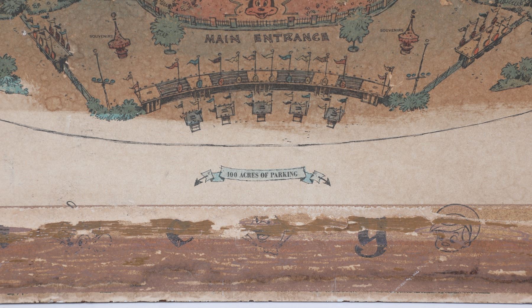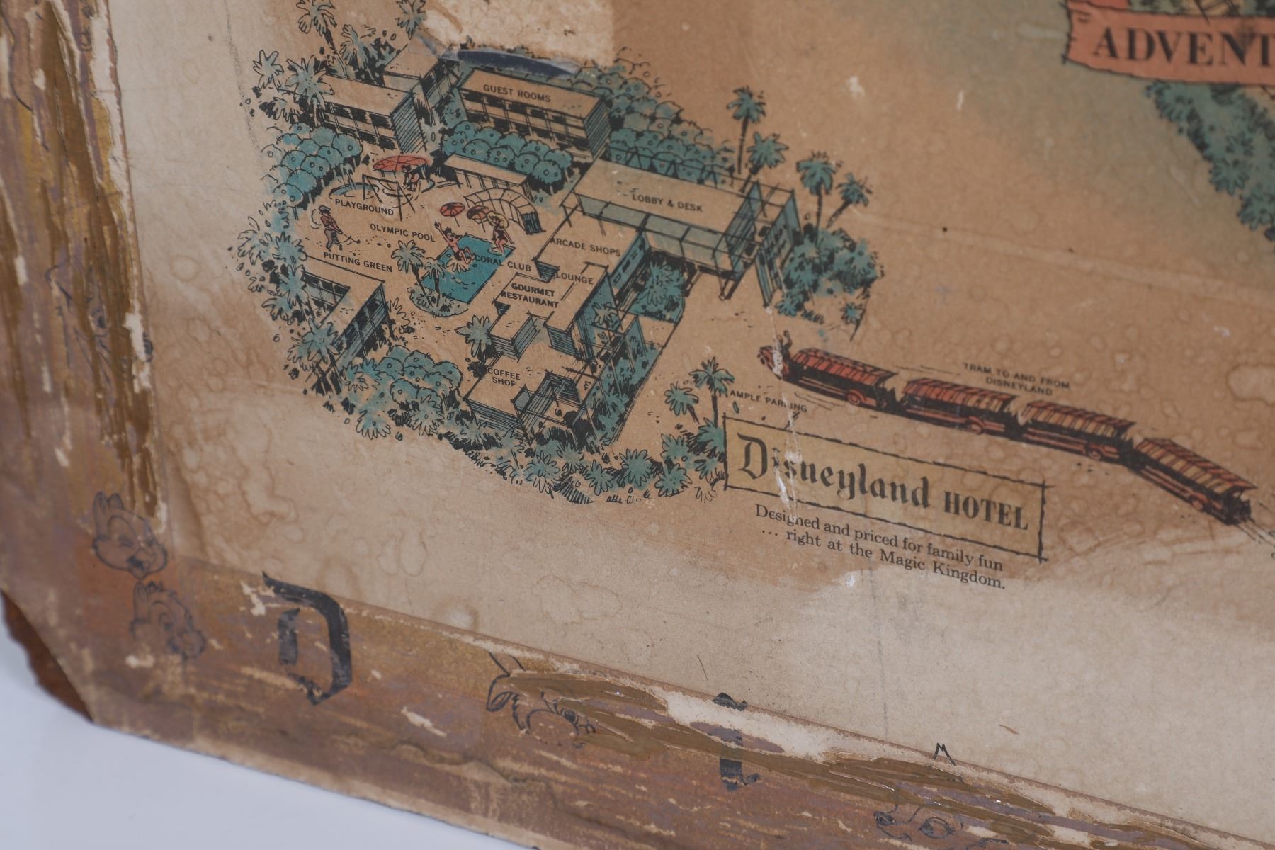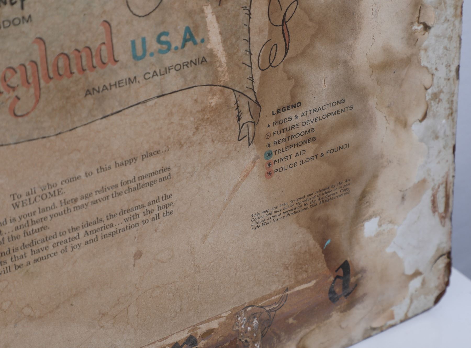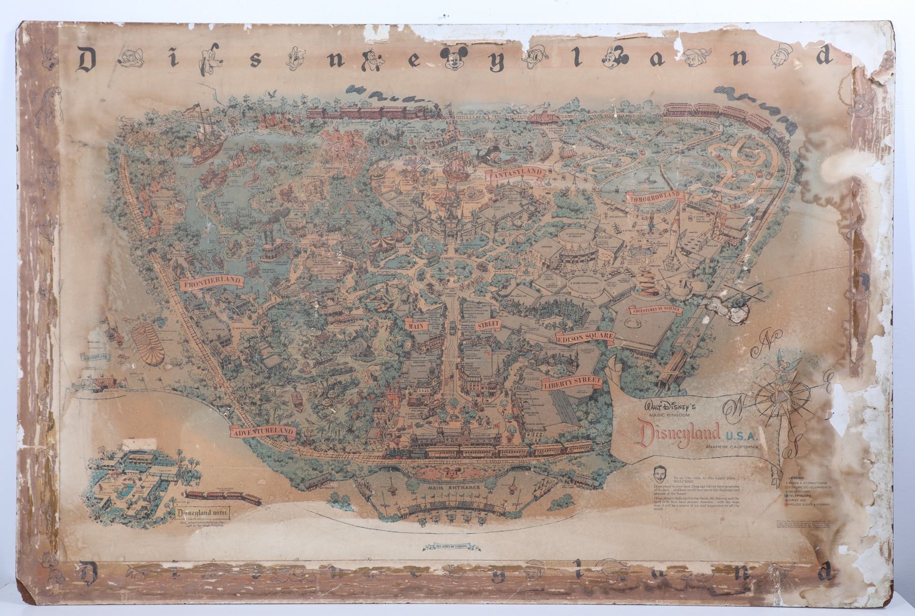 (Disneyland, c. 1958). A Disneyland 1958 Version A large park map used for display in the park. The map is in poor condition with severe wear throughout including extensive staining and loss of paper and edge wear. The novelty of this item is for the fact alone that it was used in the park to display the map. Mounted onto display board. Measures 45" x 30". Item comes with a Grand Circle Tour Auctions COA.