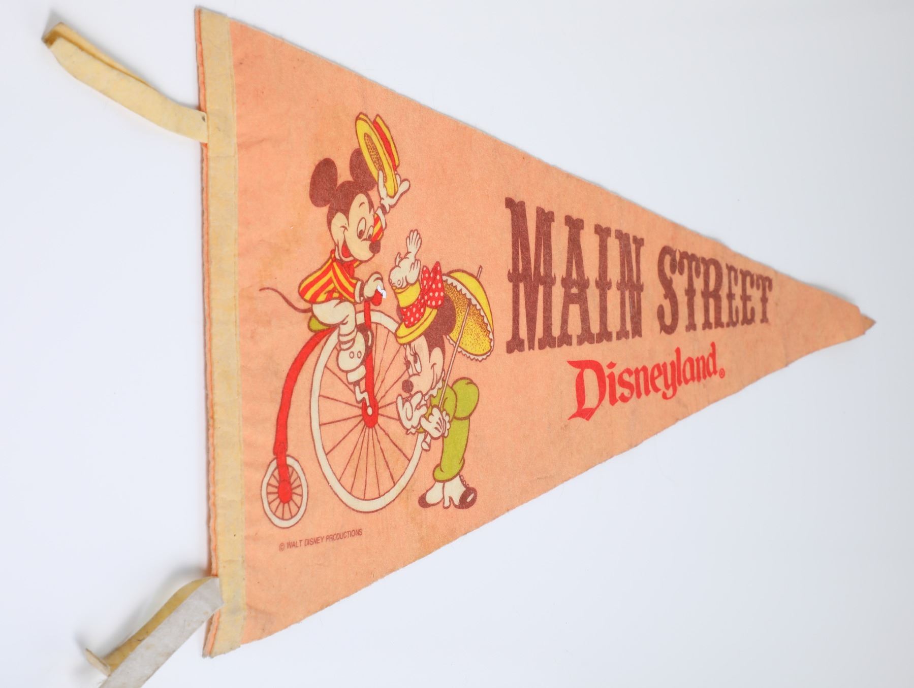 (Disneyland, c. 1960's). A rare Disneyland pennant displaying Mickey & Minnie Mouse on a light tone background and the phrase "Main Street, Disneyland". The pennant is in good condition with normal wear from age and minimal handling.