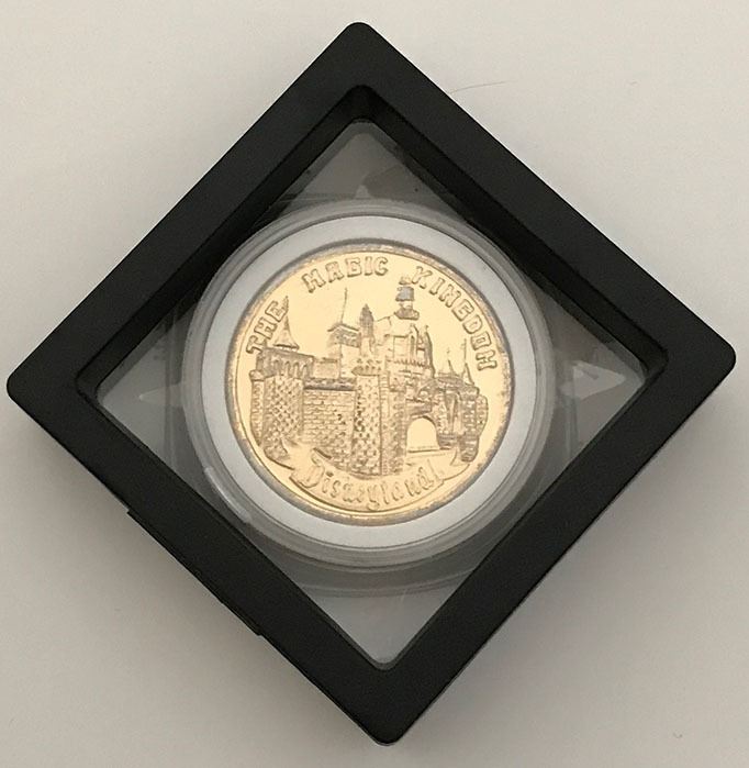 (Disneyland, c. 1960's). A rare vintage Disneyland coin featuring artwork by H. Alvin Sharpe. At the time, Sharpe was well known for his artwork in developing New Orleans Mardi Gras coins and was hired by Disney to help develop this special Disneyland celebration coin. One side display the Sleeping Beauty Castle and the other side displays the Mark Twain. The coin is in good condition with normal wear from age and handling. The coin is housed in a protector and displayed in a frame. Item comes with a Grand Circle Tour Auctions COA.