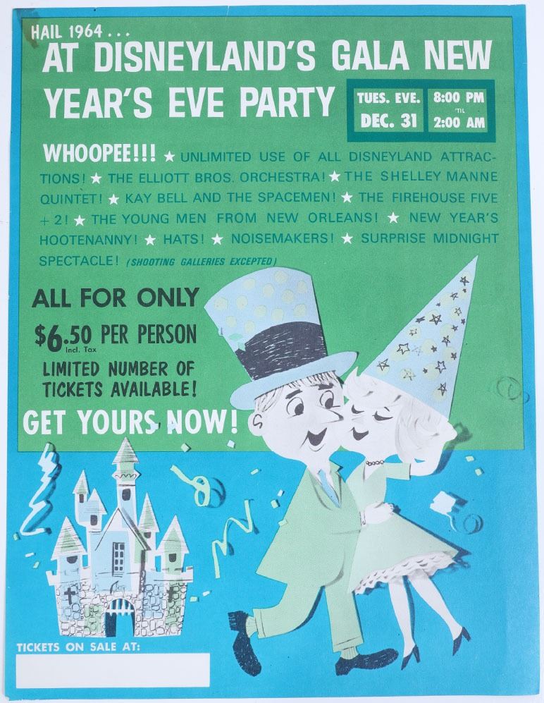 (Disneyland, c. 1964). A rare 1964 flyer for "...Disneyland's Gala New Year's Eve Party." The flyer is in good condition with normal wear from age and handling. Item comes with a Grand Circle Tour Auctions COA.