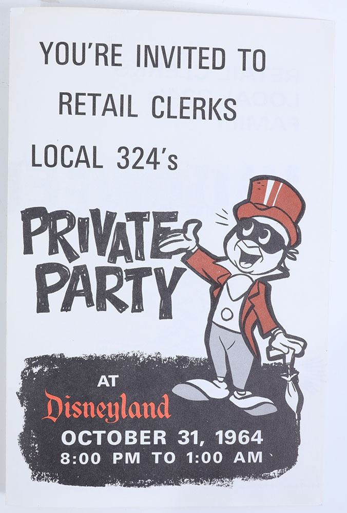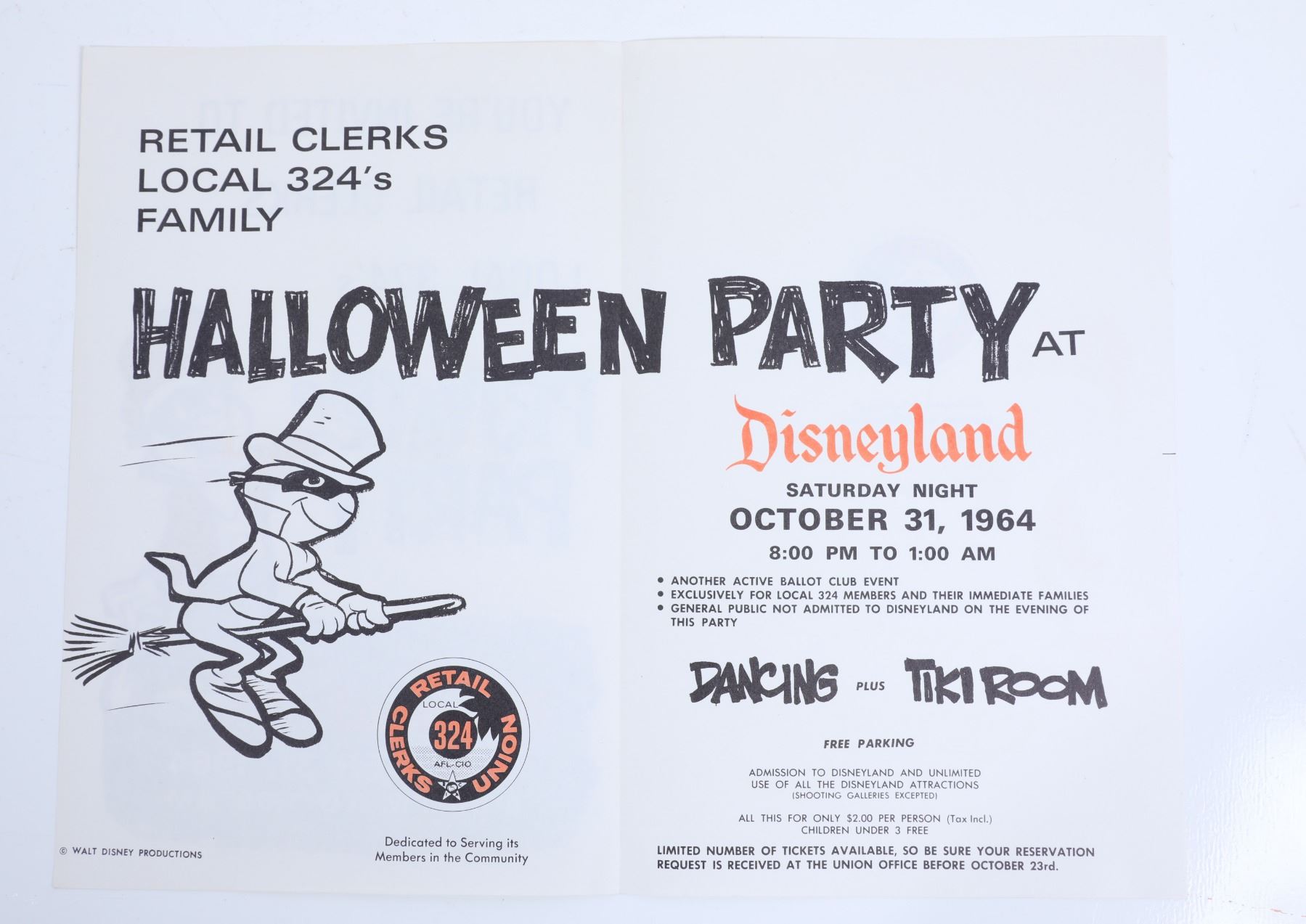 (Disneyland, c. 1964). A rare 1964 flyer for a private party on Halloween featuring the Disney character Jiminy Cricket. The flyer is in good condition with normal wear from age and handling. Item comes with a Grand Circle Tour Auctions COA.