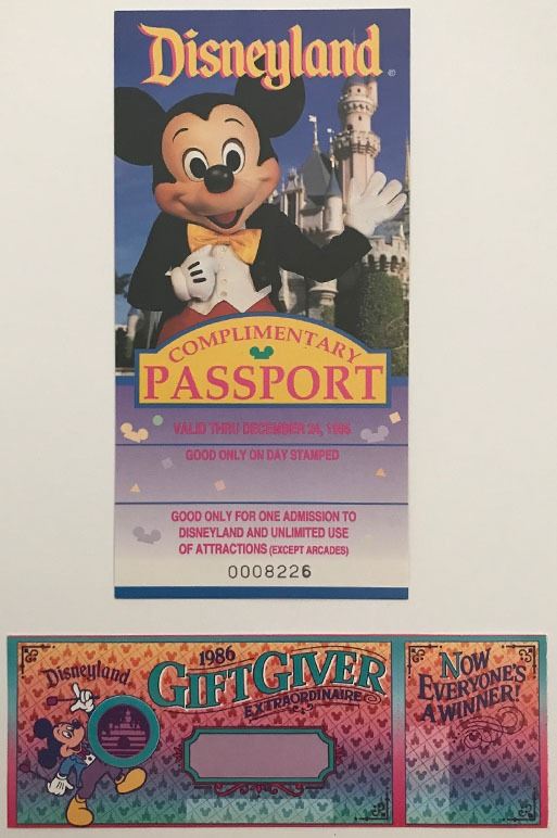 (Disneyland, c. 1980's-90's). A set of unused Disneyland tickets, one a complimentary ticket featuring Mickey Mouse and another a Gift Giver ticket. The tickets are in good condition with normal wear from age and minimal handling. Item comes with a Grand Circle Tour Auctions COA.