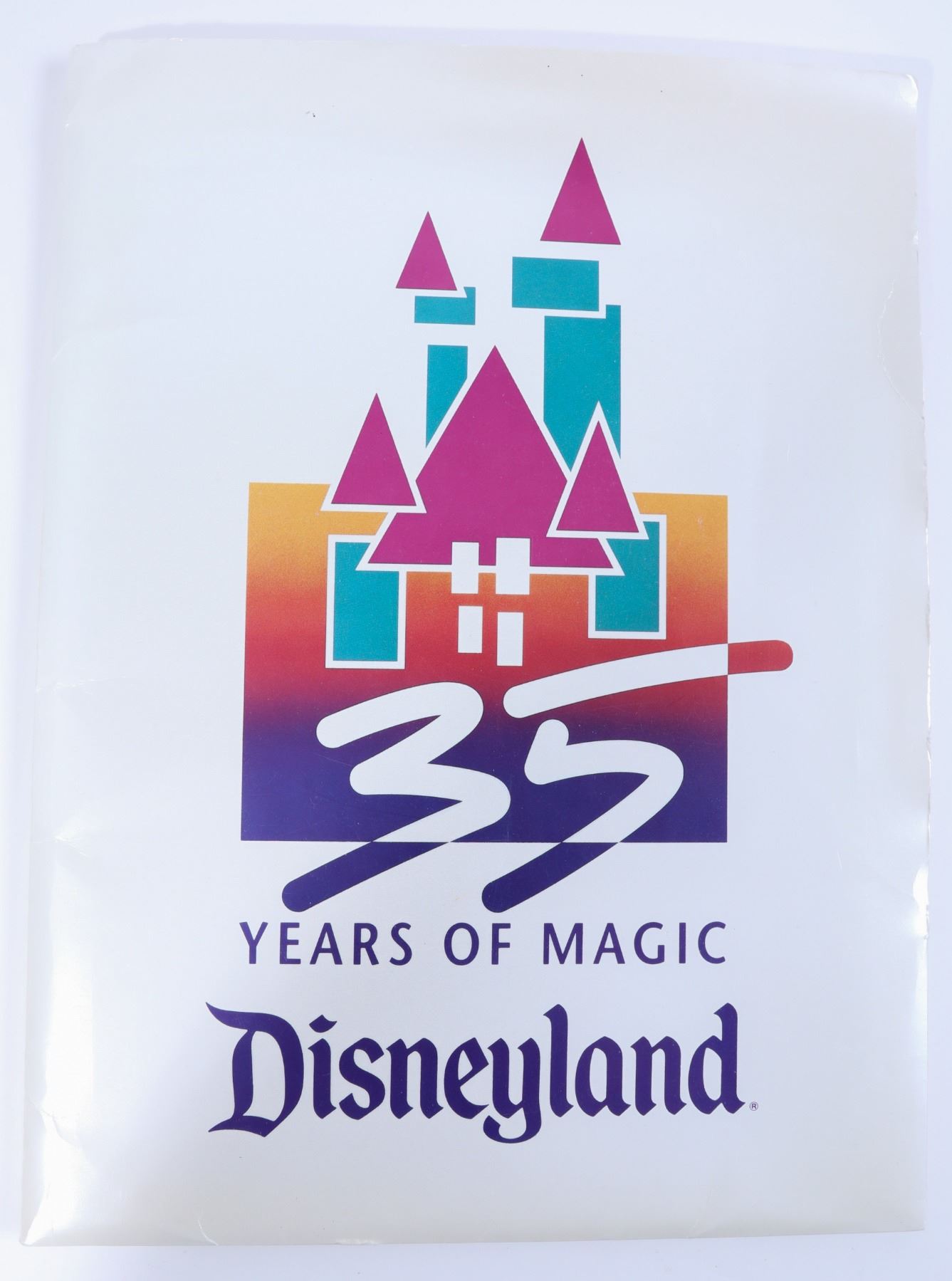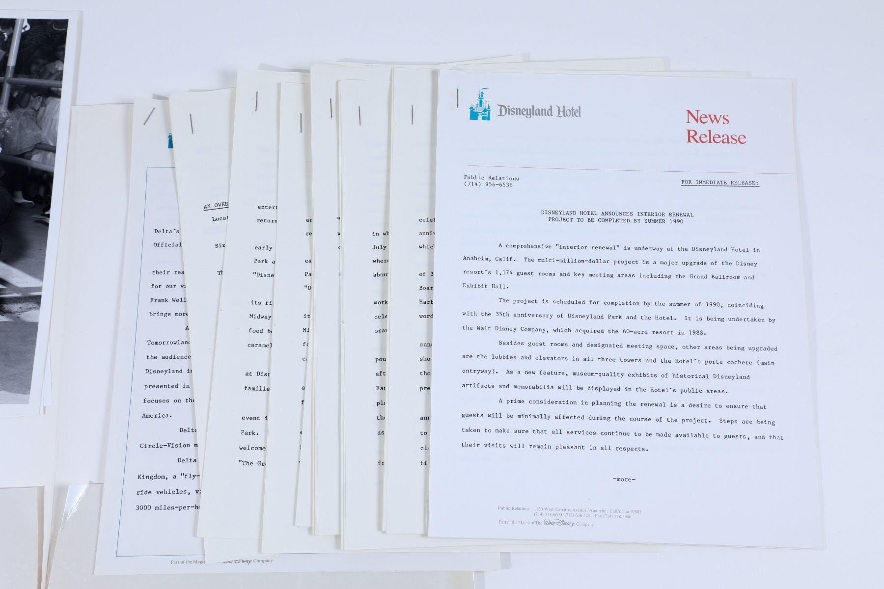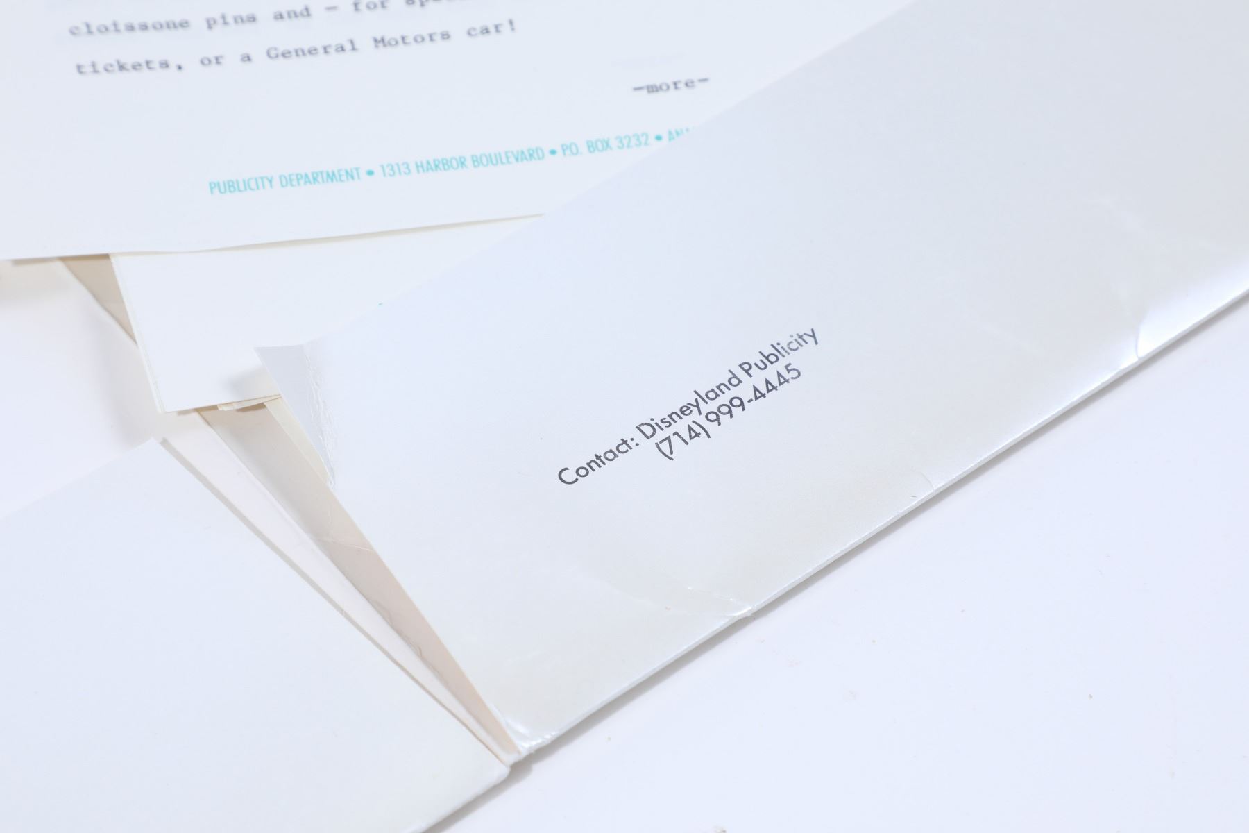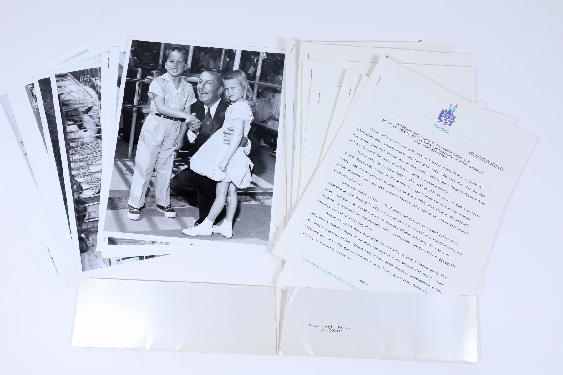 (Disneyland, c. 1990). A Disneyland 1990 Press Kit containing press news release papers and photographs highlighting Disneyland park through the years since opening year 1955 and up through the 35th anniversary. The items is in good condition with normal wear from age and use, including some minor edge wear. Item comes with a Grand Circle Tour Auctions COA.
