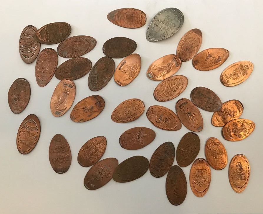 (Disneyland, c. 1990's-2010's). A collection of 35 Disneyland pressed coins. The coins range in characters and attractions that include Peter Pan, Tinker Bell, Snow White, Doumbo, Mickey Mouse, Pluto, Fantasyland, Tomorrowland, Adventureland, New Orleans Square, Enchanted Tiki Room, Matterhorn, and more. The coins range in condition from fair to good with normal wear from age and handling. Item comes with a Grand Circle Tour Auctions COA.