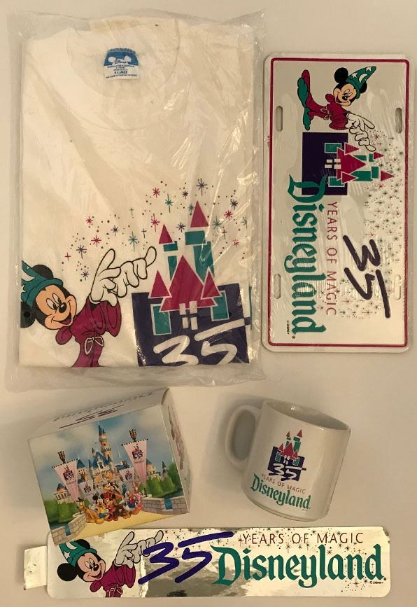 (Disneyland, c. 1990). A set of Disneyland 35th anniversary items including an unused license plate, mug, XL shirt and bumper sticker. The items are in good condition with normal wear from age and minimal handling. Item comes with a Grand Circle Tour Auctions COA.