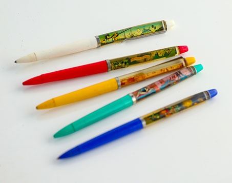 (Disneyland, c. 1990). A rare set of pens celebrating the 35th anniversary of Disneyland and highlighting specific lands, attractions and characters of Disneyland. The pens are in working condition and just have normal wear from age and minimal handling.