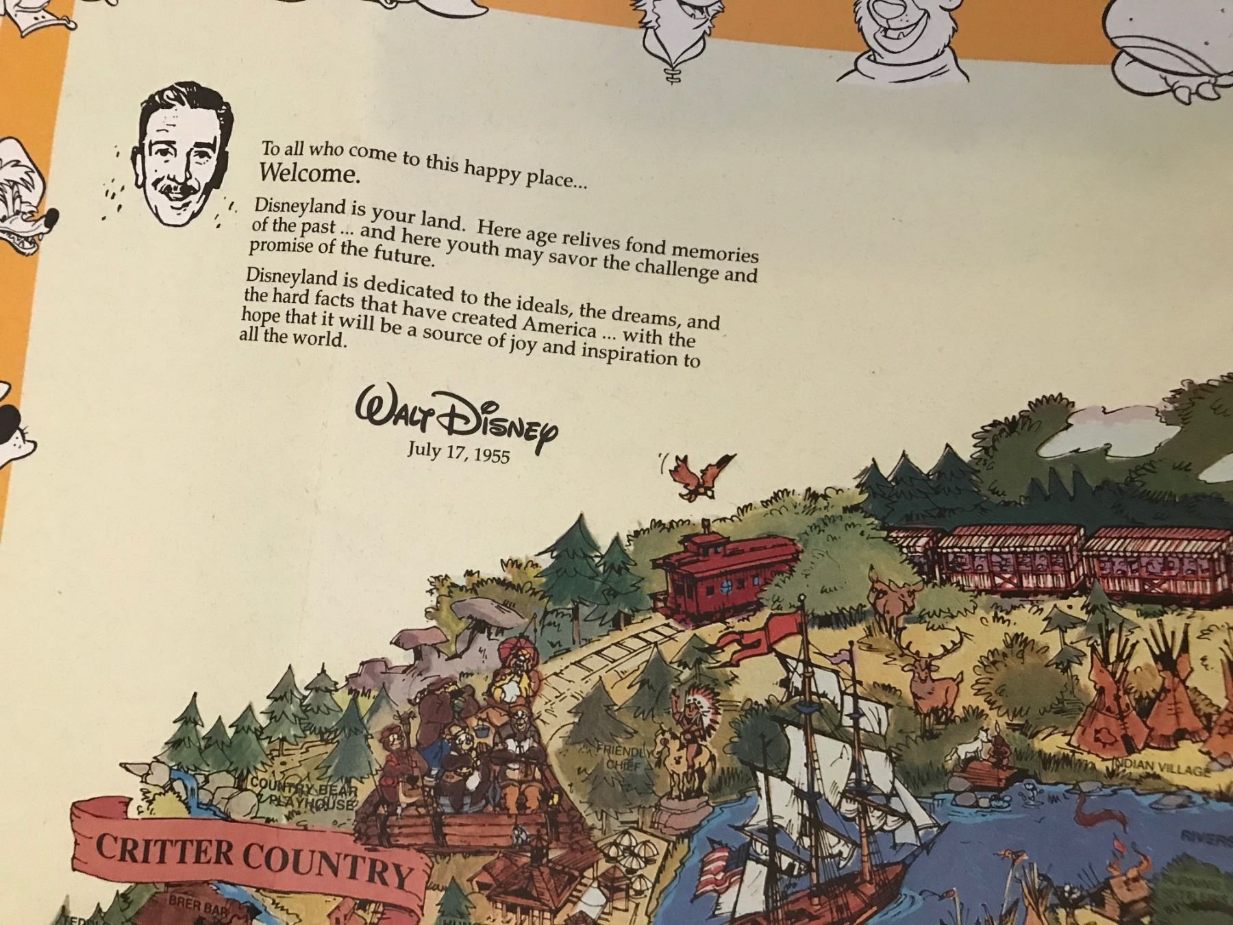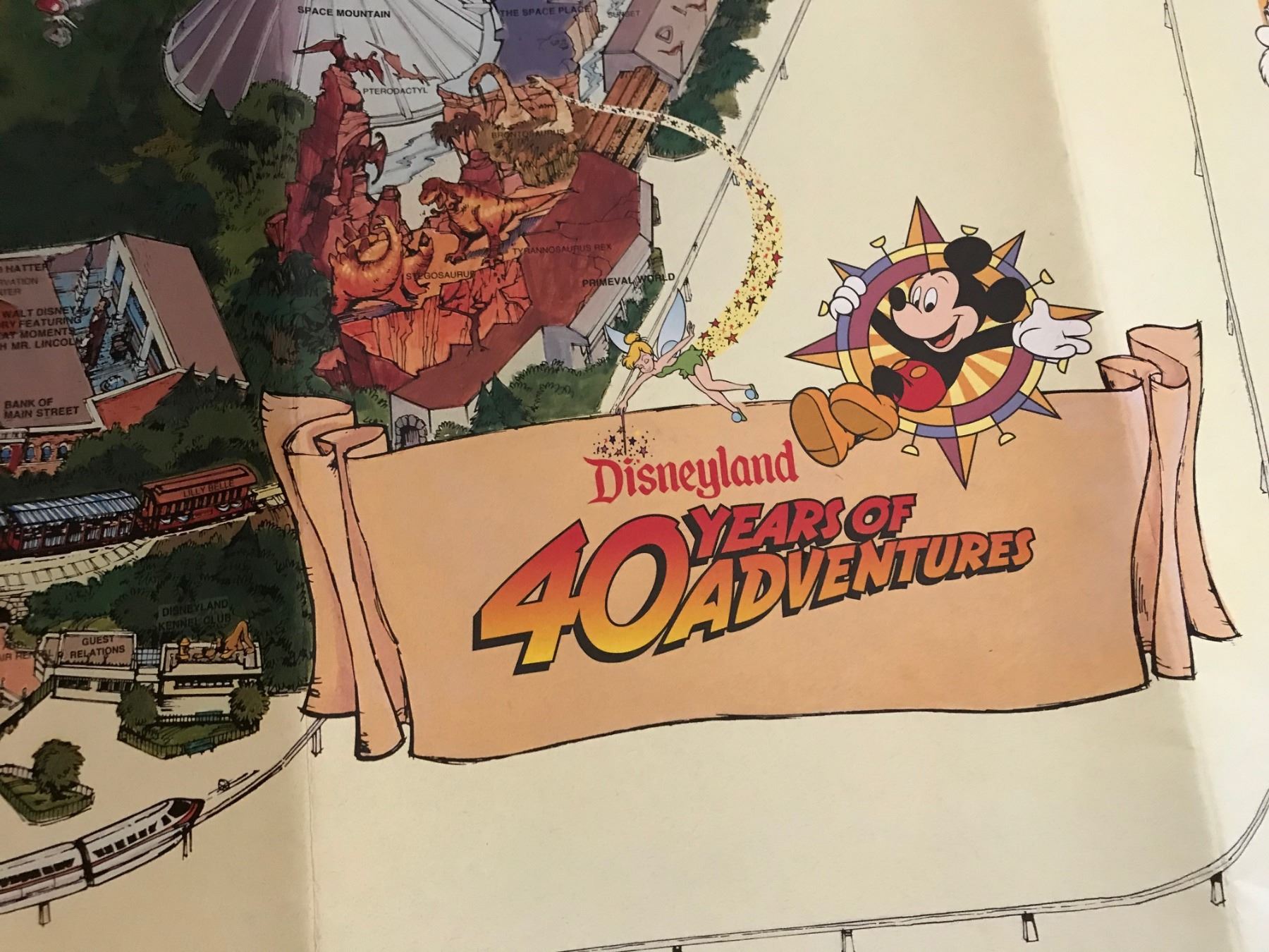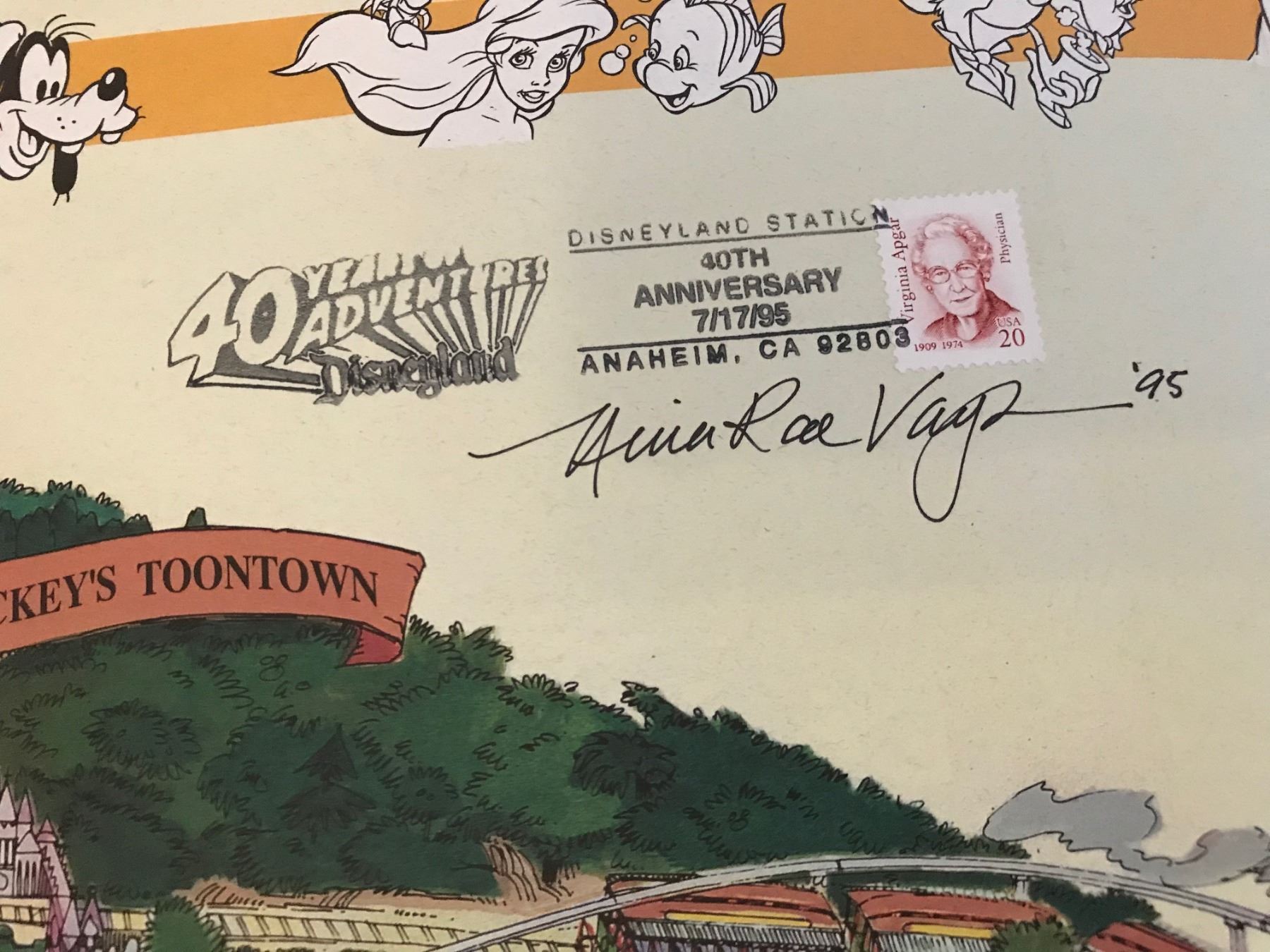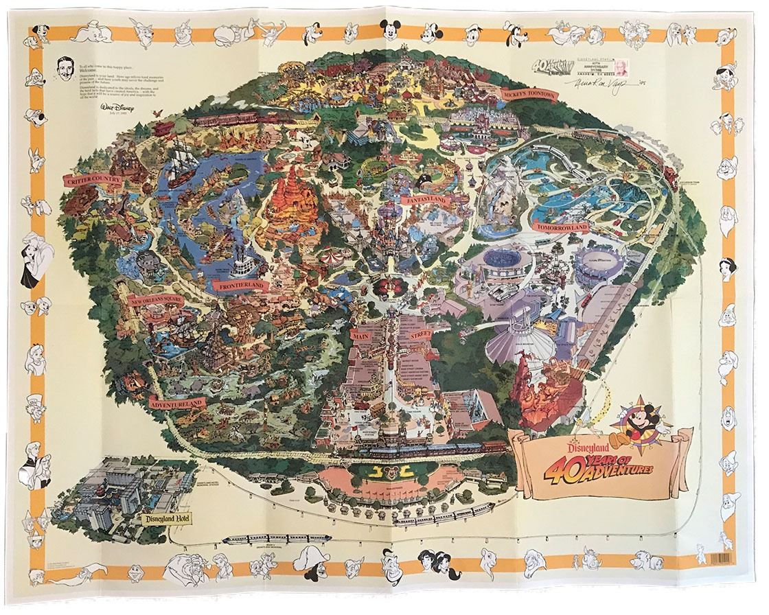 (Disneyland, c. July 17, 1995). A rare artist signed version, dated July 17, 1995 (for the exact 40th anniversary of the park opening), Disneyland 1995 large park map. The 40th anniversary Disneyland large park map was created by Disney artist Nina Rae Vaughn who worked as a Special Effects Designer for WED Enterprises for 3 years and as Director Design & Illustrator for Walt Disney Imagineering for 18 years. The map measures approximately 34" x 27" and is in good condition with normal wear from age and minimal handling. Item comes with a Grand Circle Tour Auctions COA.