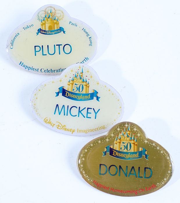 (Disneyland, c. 2005). A rare set of Disneyland 50th anniversary character name badges for "Mickey", "Donald" and "Pluto." The badges each display the Sleeping Beauty Castle 50th anniversary logo at top and the "Mickey" name tag has the very rare text of "Walt Disney Imagineering." The badges are in good condition with normal wear from age and minimal handling. Item comes with a Grand Circle Tour Auctions COA.