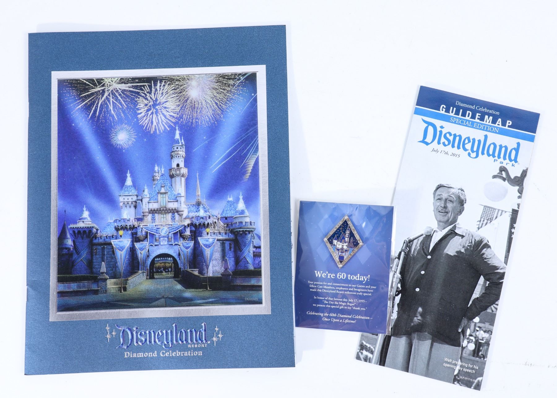 (Disneyland, c. 2015). A Disneyland 60th anniversary packet including a celebration guide, brochure and pamphlet. The items are in good condition with normal wear from age and minimal handling. Item comes with a Grand Circle Tour Auctions COA.