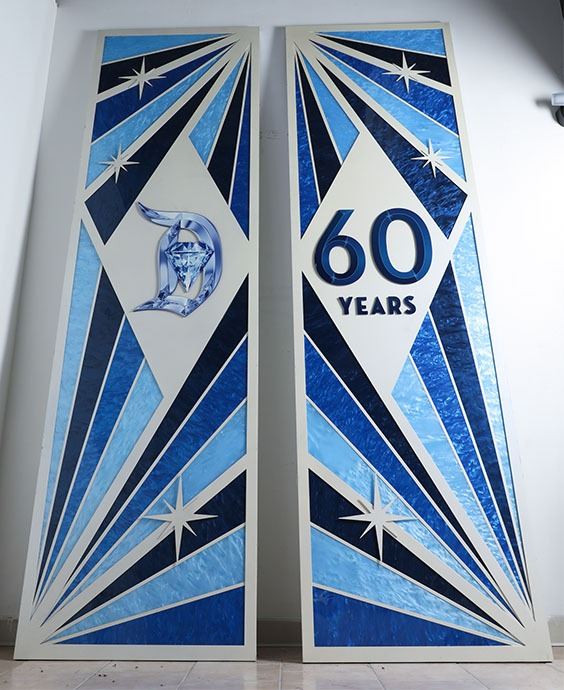 (Disneyland, Disneyland Hotel, c. 2015). A set of very rare, oversized and exquisite Disneyland Hotel used prop displays made for Disneyland's 60th Diamond Anniversary. One display features a large Disneyland style "D" with a sparkling diamond graphic. The other display features a large graphic of "60 YEARS." The displays are in good condition with normal wear from age and use in the park. Each sign measures approximately 113" x 33 1/2" x 2". Item comes with a Grand Circle Tour Auctions COA.