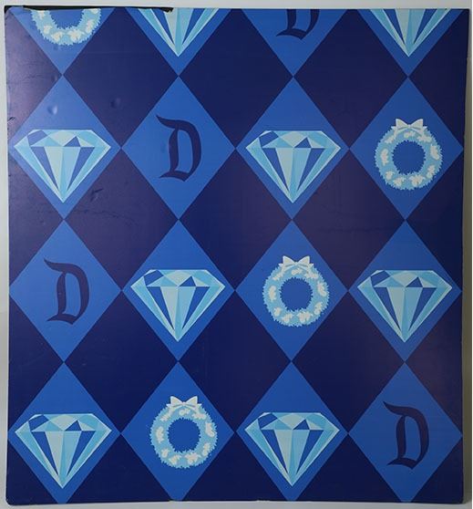 (Disneyland, c. 2015). A park used prop sign made for Disneyland's 60th Diamond Anniversary celebration during the holidays. Featuring a pattern of diamonds, classic Disneyland "D" and Christmas wreaths. The sign is in very good condition with normal wear from age and use in the park.