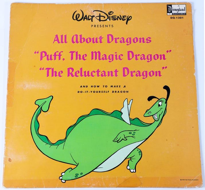 (Disneyland, c. 1966). A Disneyland "All About Dragons" record album. The album contains recordings for songs such as "Puff, The Magic Dragon" and "The Reluctant Dragon." The album is in good working condition with normal wear from age and handling. The record size is 12" and speed 33 RPM. Item comes with a Grand Circle Tour Auctions COA.