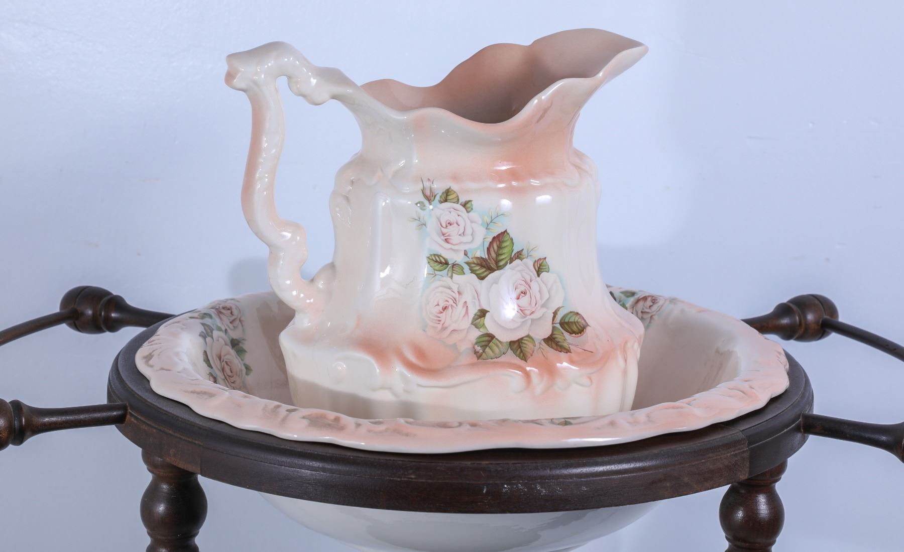(Disneyland, c. 2000's). A rare Disneyland vintage hand wash station that was used as a prop in the Disneyland Baby Care Center located on Main Street U.S.A. This was a static prop, not intended for use. Made of ceramic with a decorative and glossy finish. The bowl, water pitcher and wooden stand props are in good condition with normal wear from age and park use. Used for display, therefore has minimal wear from handling. The stand measures approximately 29 1/2" tall by 23" and with the Pitcher on top it's 37" tall (combined). Item comes with a Grand Circle Tour Auctions COA.