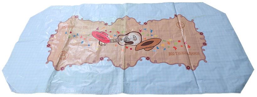 (Disneyland, c. 2000's). A rare park used Frontierland, Big Thunder Ranch prop table cloth with Toy Story theme displaying Woody's hat and guitar and Jessie's hat. The tablecloth is in good condition with normal wear from age and minimal handling.