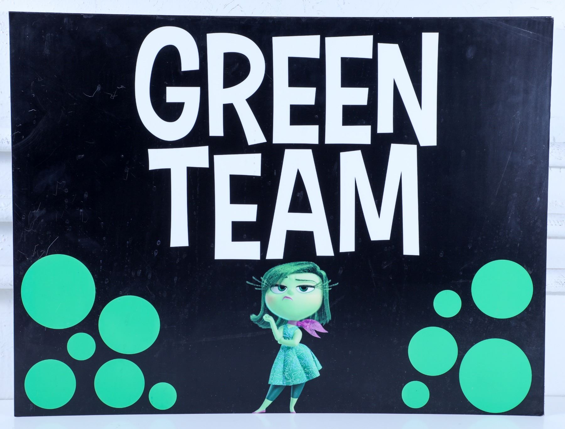(Disneyland, c. 2015). A Disneyland parked used sign for the cast member canoe race. The sign is for the Green Team and has the character Disgust from the Disney Pixar film "Inside Out." The sign is in good condition with normal wear from age and park use. Measures 24" x 18". Item comes with a Grand Circle Tour Auctions COA.