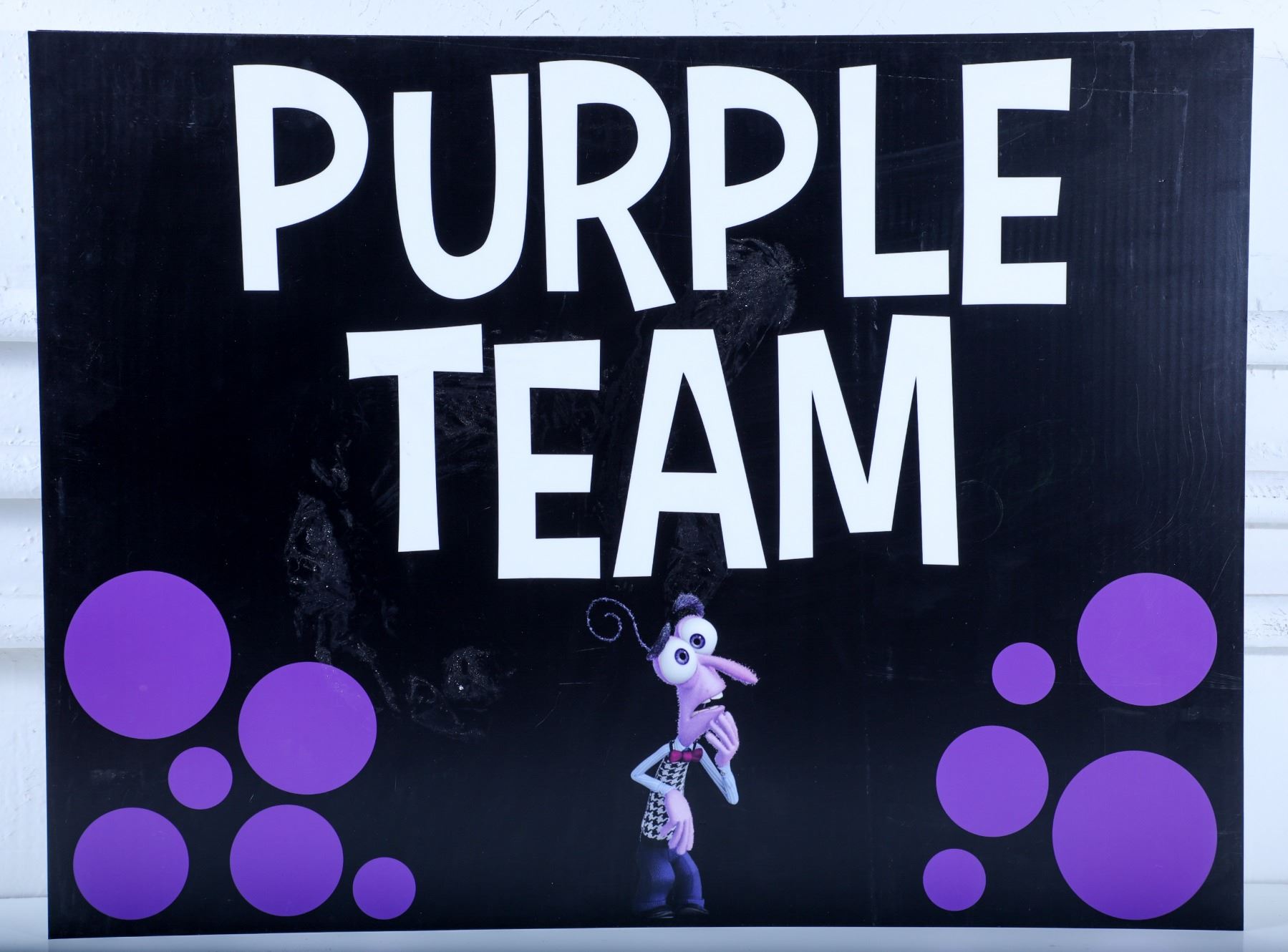 (Disneyland, c. 2015). A Disneyland parked used sign for the cast member canoe race. The sign is for the Purple Team and has the character Fear from the Disney Pixar film "Inside Out.". The sign is in good condition with normal wear from age and park use. Measures 24" x 18". Item comes with a Grand Circle Tour Auctions COA.