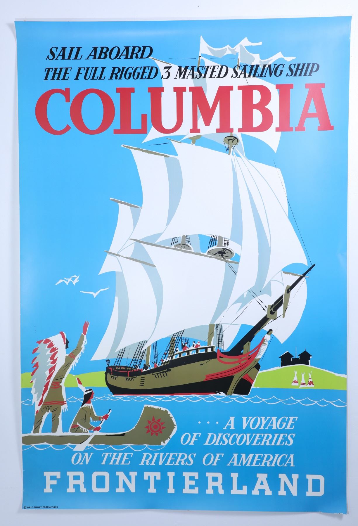 (Disneyland, Disney Gallery, c. 1990's). A rare Disneyland Columbia attraction poster measuring approximately 54" x 36" and originally sold in the Disney Gallery in the 1990's. The Disney Gallery sold these posters featuring the original artwork and size as the original silkscreen posters that were created for use in the park. The poster is in good condition with normal wear from age and handling. Printed on thick stock paper. Item comes with a Grand Circle Tour Auctions COA.