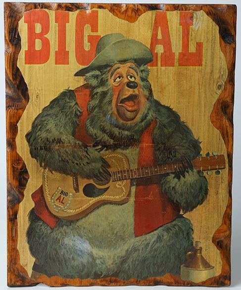 (Disneyland, c. 1970's-80's). Disneyland "Country Bear Jamboree" opened on March 4, 1972. One of the last attractions of the park that Walt Disney oversaw, his favorable comments to Marc Davis on the concept art of the lovable bears was the last time Marc Davis would see Walt Disney, as he passed away only a few days later. Offered here is an original "Big Al" poster that has been secured to a wooden display. Big Al being a fan-favorite of all the bears from Country Bear Jamboree. The wall art remains in good condition with minor wear.