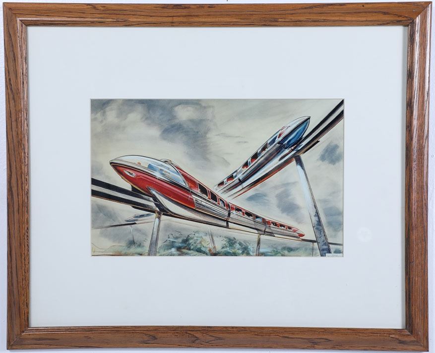 (Disneyland, c. 1991) A concept art print by Imagineer John Hench titled "Crossing Monorails." The print has an image size of 8.25" x 13.25" and is in good condition with normal wear from age and handling. Item comes with a Grand Circle Tour Auctions COA.