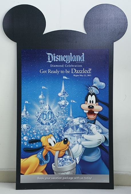 (Disneyland, c. 2015). Disneyland celebrated its 60th Diamond Anniversary in 2015. This park used prop sign celebrates the anniversary with a customized Mickey Mouse Ears top and displays the fan-favorite Disney characters Goofy and Pluto. Sign was used as a promotional tool to advertise the 60th Celebration.
