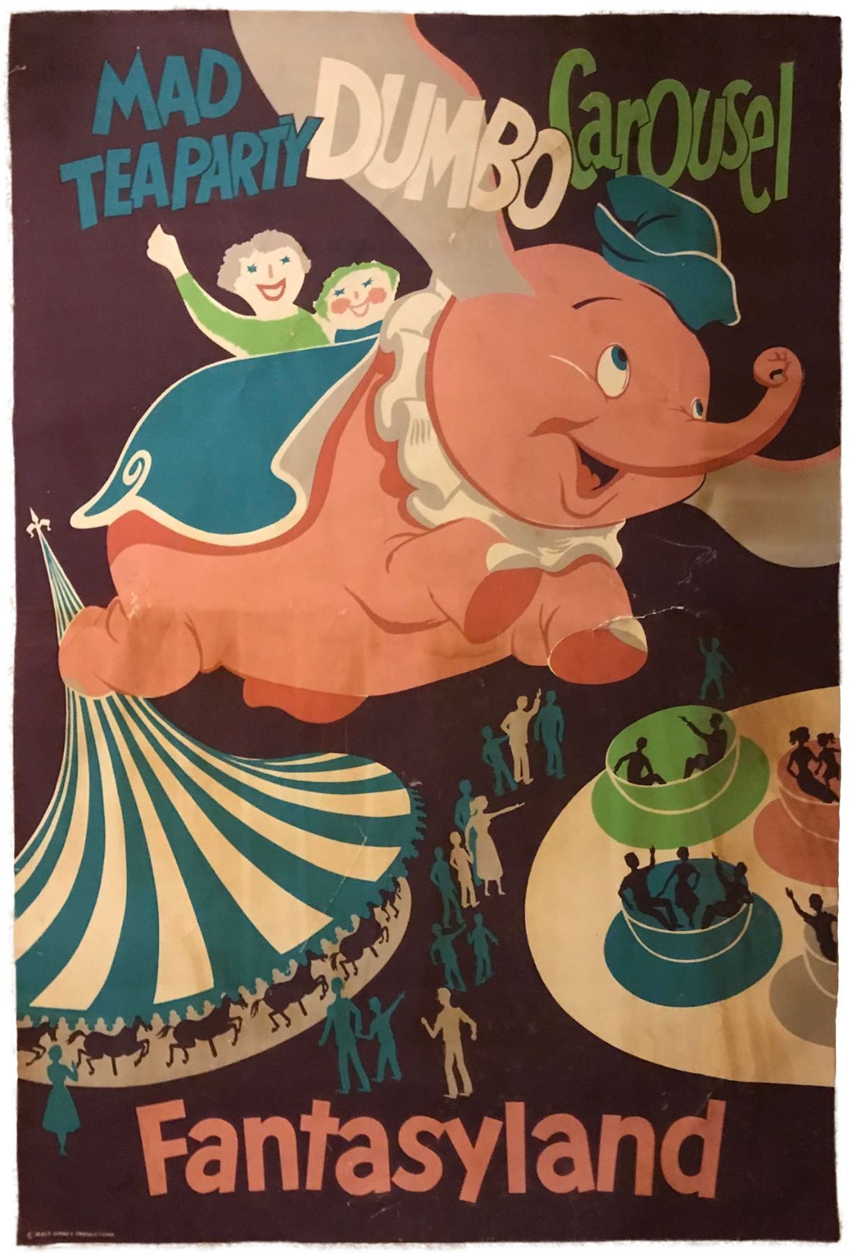 (Disneyland, c. 1955). Disneyland opened on July 17, 1955, offering access to several attractions based on famous Disney characters like Snow White, Peter Pan and Dumbo. Offered here is a very rare 54"x 36" Dumbo silkscreen attraction poster featuring the early "pink version" of Dumbo. The poster has spotting and tears from park use but has been linen-backed to help preserve and protect it.