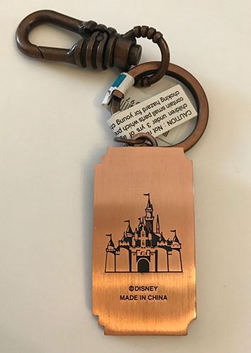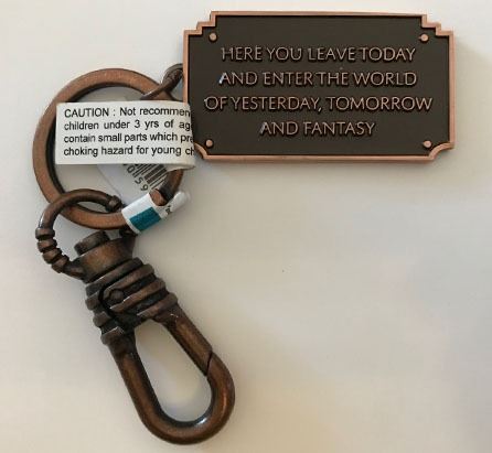 (Disneyland, c. 2005). A rare Disneyland keychain presenting a small version of the park's famous entrance plaque that reads "Here You Leave Today and Enter the World of Yesterday, Tomorrow and Fantasy." The reverse side is copyrighted Disney and displays an image of Sleeping Beauty Castle. The keychain is in good condition with normal wear from age and minimal handling. Item comes with a Grand Circle Tour Auctions COA.