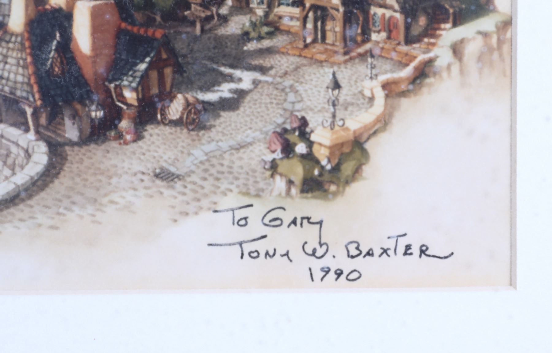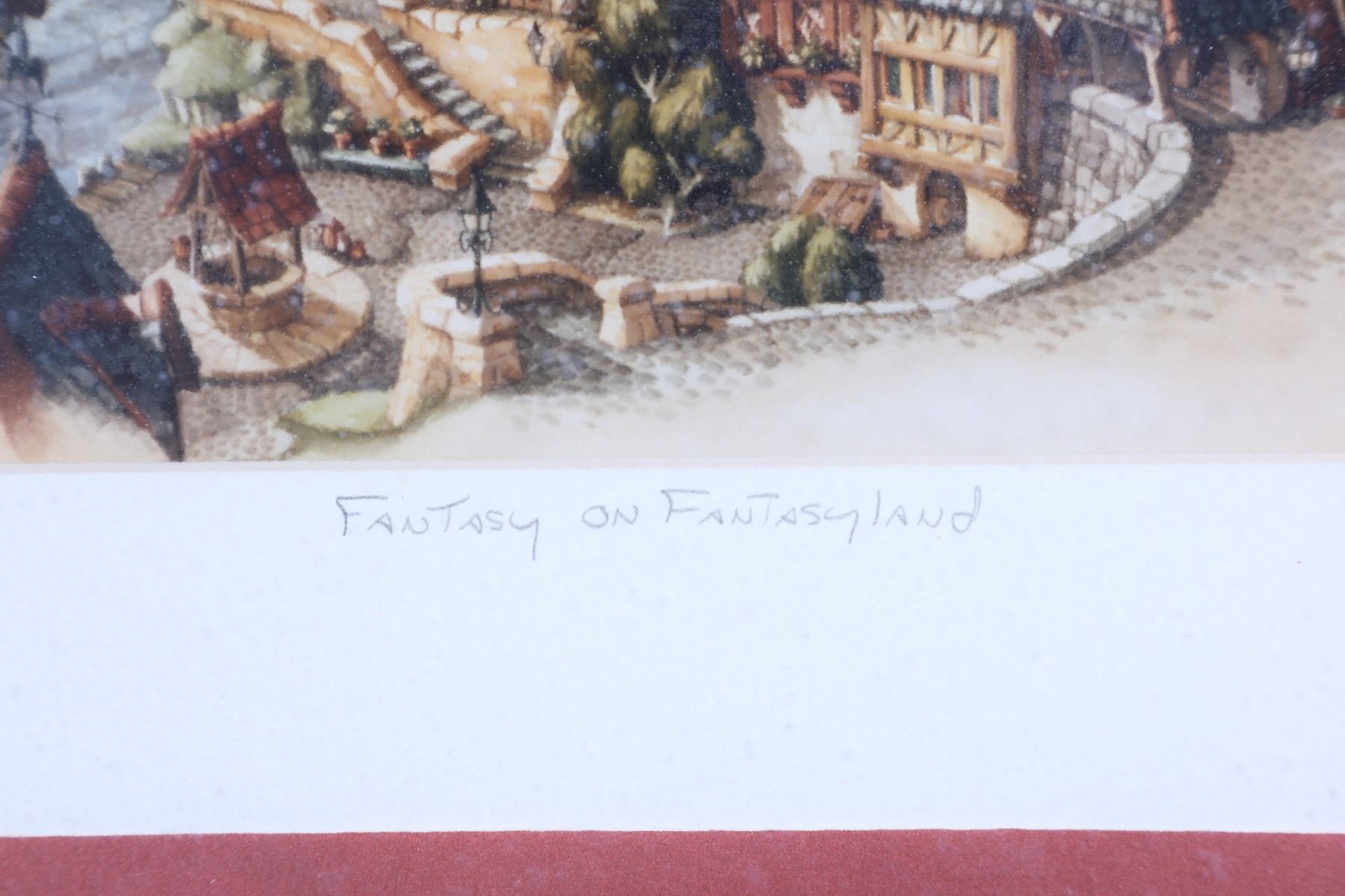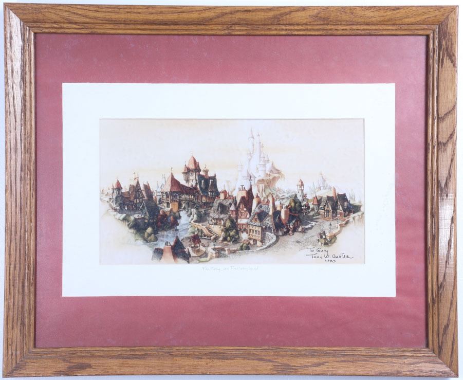 (Disneyland, Disney Gallery, c. 1990). A very rare Disneyland serigraph "Fantasy on Fantasyland" signed by Imagineer Tony Baxter and marked as "To Gary." The serigraph measures approximately 22" x 16.5" and is in good condition with normal wear from age and minimal handling. Item comes with a Grand Circle Tour Auctions COA.