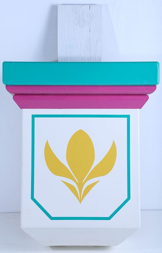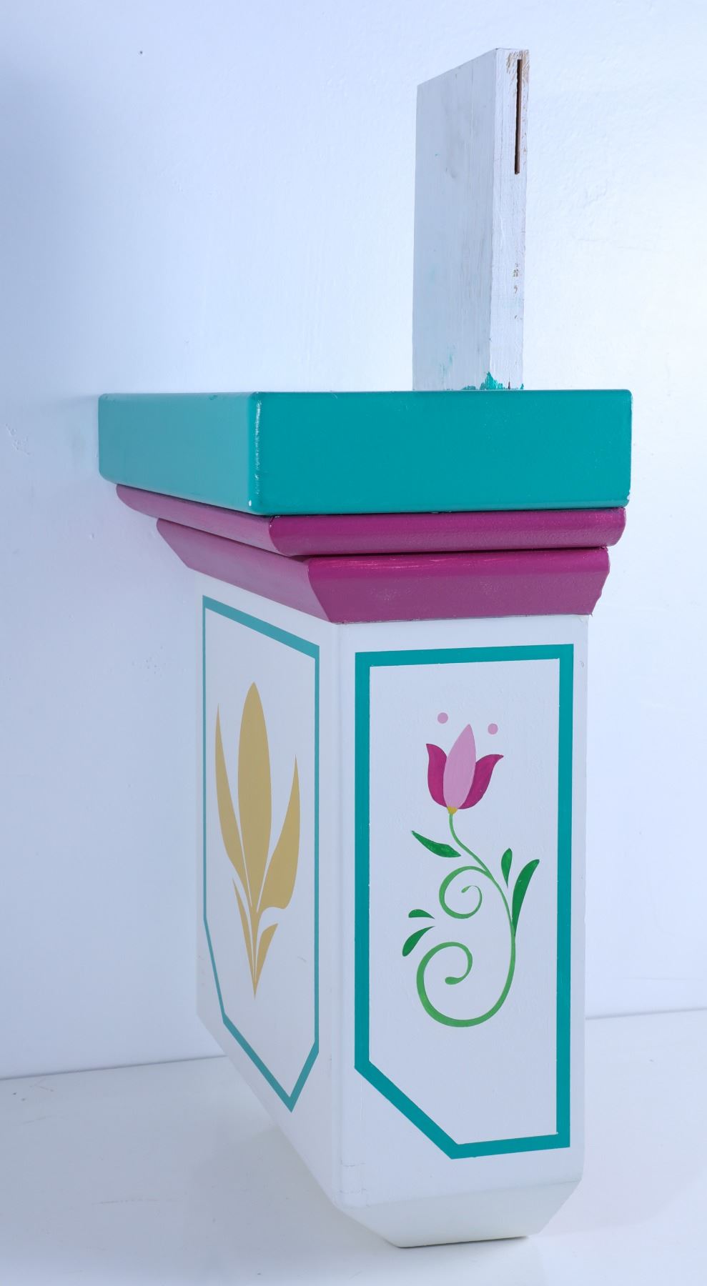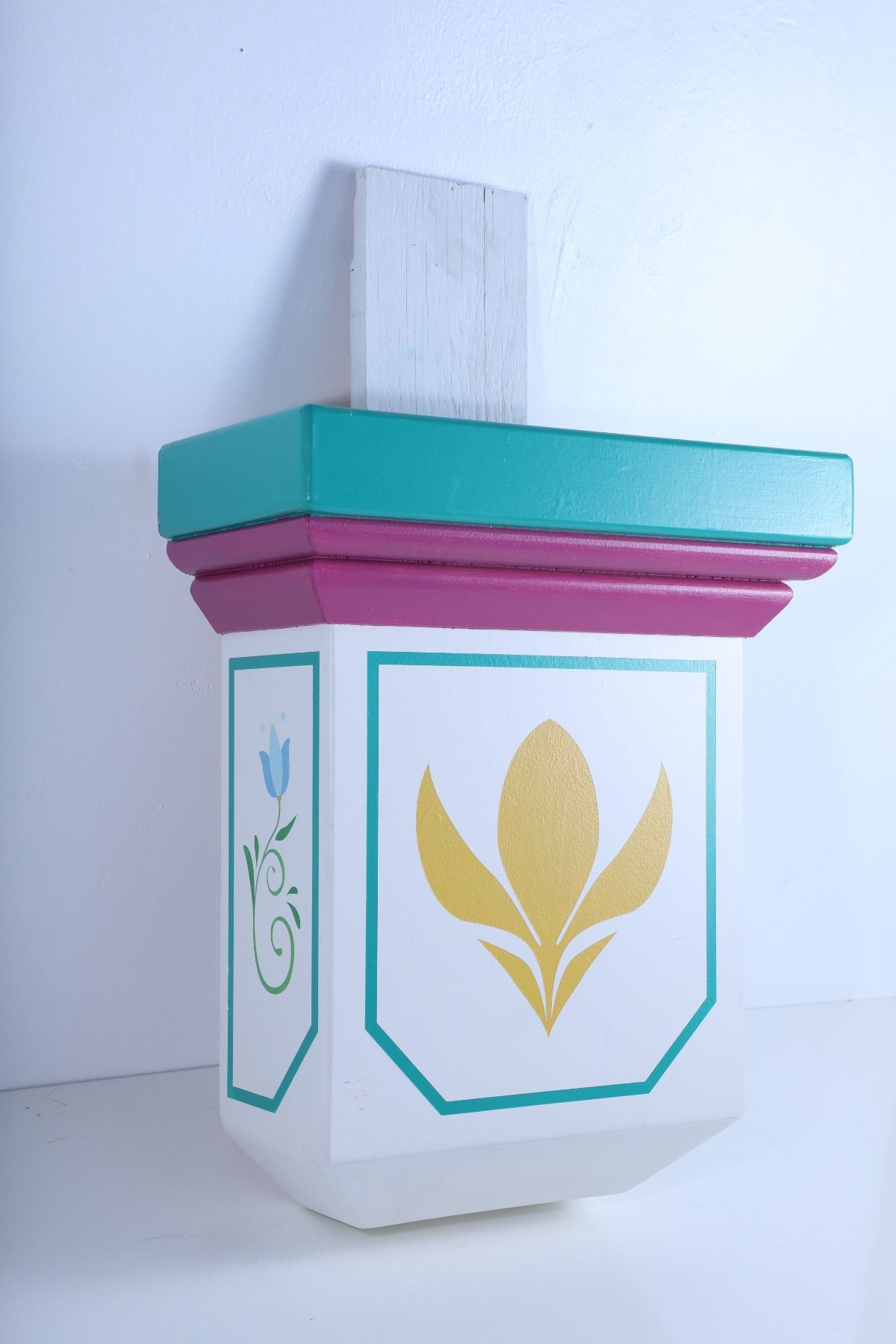 (Disneyland, c. 1990's-2000's). A rare Disneyland park used facade prop used at Fantasyland's Edelweiss Snacks, located across from the Matterhorn. The prop piece displays beautiful flower artwork with white, teal, gold and purple colors that are frequent to the Matterhorn area of the park. The prop is in good condition with normal wear from age and park use. Measures approximately 23 1/2" x 14" x 7". Item comes with a Grand Circle Tour Auctions COA.
