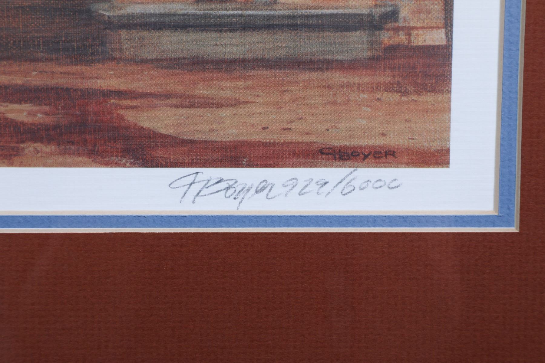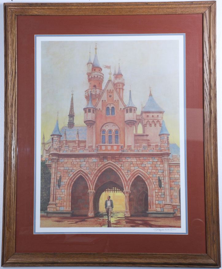 (Disneyland, Disney Gallery, c.1985). A very rare Disney lithograph "Footsteps" signed by artist Charles Boyer and in a limited edition size of 6000 (#929 of 6000). The lithograph shows Walt Disney walking under Sleeping Beauty Castle in 1964 on an early Saturday morning before the park was opened. Based on a famous photograph taken by Renie Bardeau. Considered one of Boyer's more sought after lithographs. The item measures approximately 33" x 26.5" and is in good condition with normal wear from age and minimal handling. Item comes with a Grand Circle Tour Auctions COA.