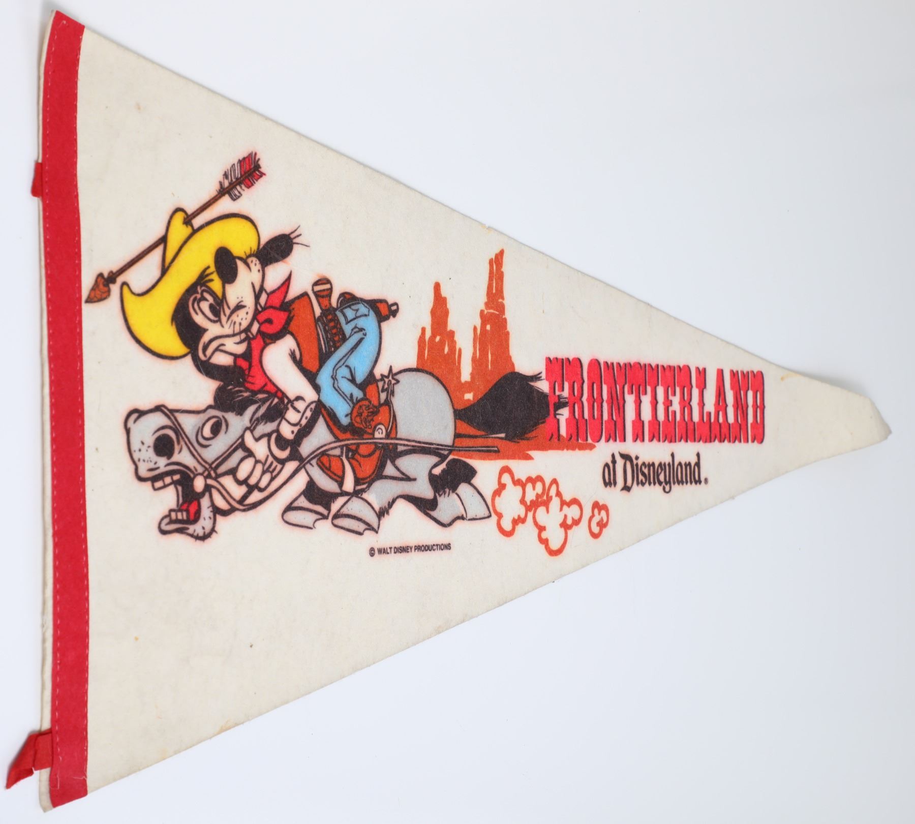 (Disneyland, c. 1960's). A rare Disneyland pennant displaying Goofy on a white background and the phrase "Frontierland at Disneyland." The pennant is in good condition with normal wear from age and minimal handling.
