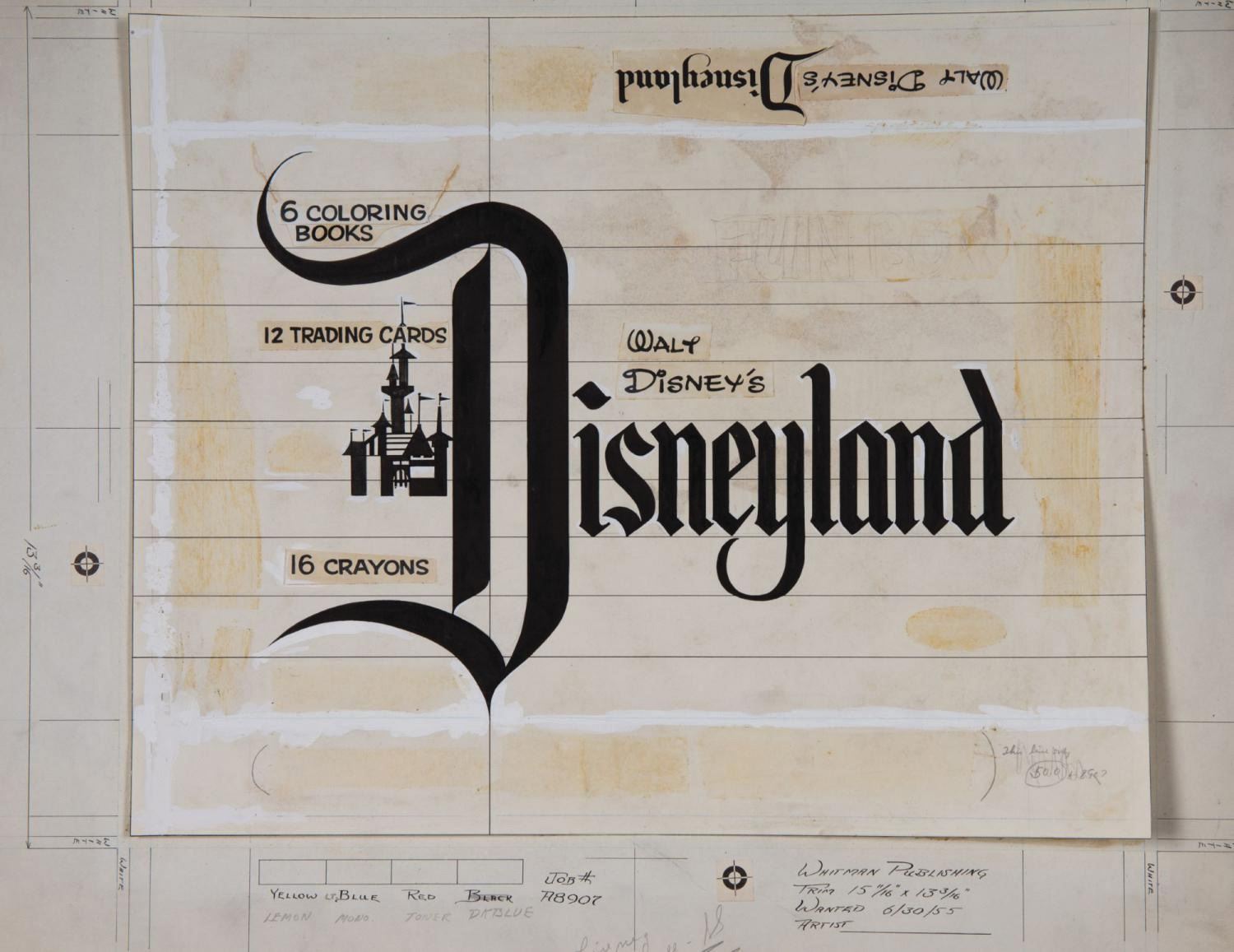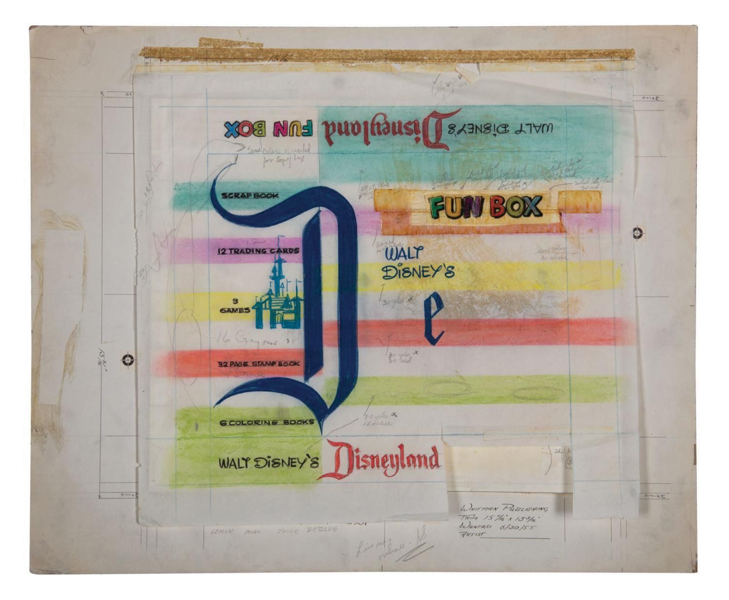 (Disneyland, 1955) An original mixed-media artwork used in the creation of the Disneyland Fun Box game by Whitman Publishing. The pre-opening Disneyland product packaging was for the popular fun box containing puzzles, games, coloring books, and more. Accomplished on vellum and artist's board, the artwork includes numerous production notes. Measuring 17.75"x21.5", the piece displays in very good condition, exhibiting some discoloration, scuffs, and minor wear to edges and corners.