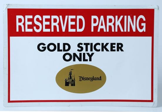 (Disneyland, c. 1980's-90's). Rare "Gold Sticker Only" VIP reserved parking sign. This prop used park sign is in good condition with normal wear from age and park use.