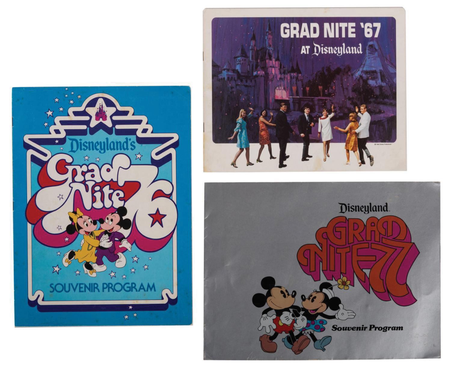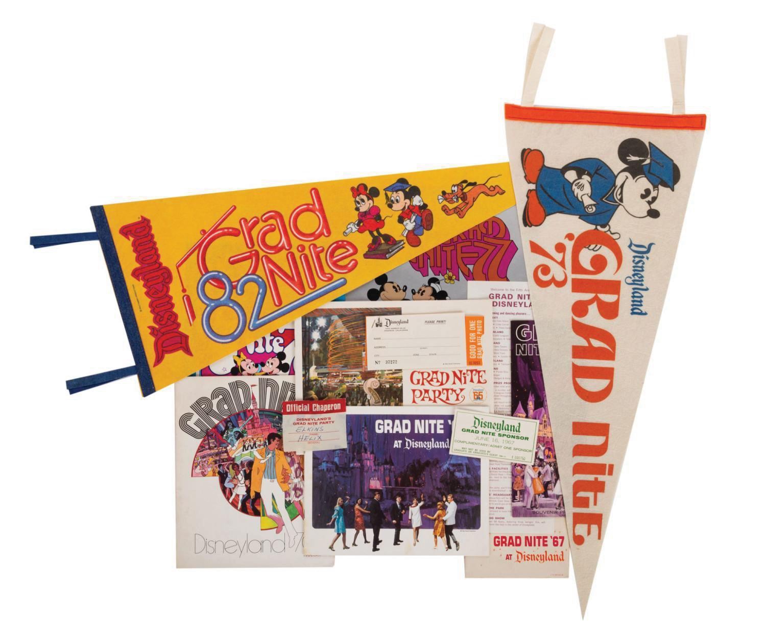 (Disneyland, 1963-83) A collection of Grad Nite souvenirs spanning twenty years of Disneyland history. The collection includes an assortment of pennants, programs, tickets, and more from these popular and memorable events. The souvenirs are in overall good condition with varying amounts of minor wear throughout.