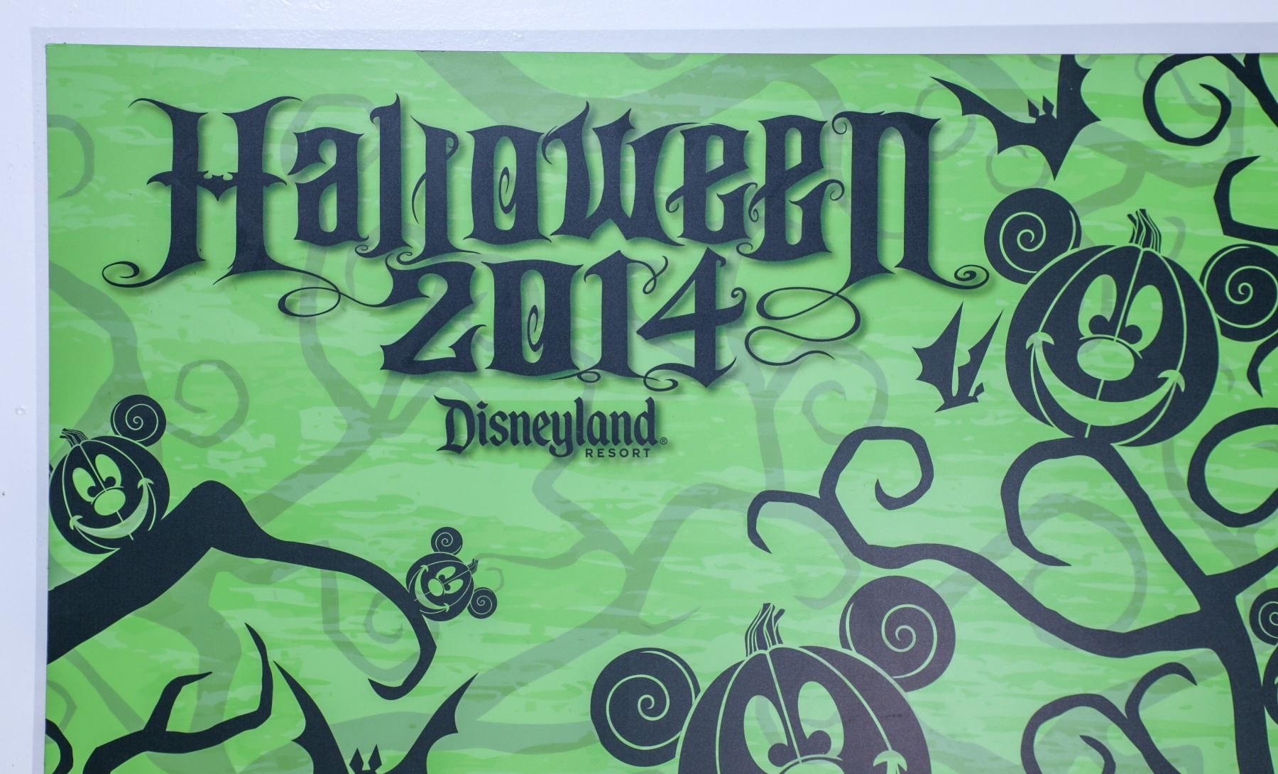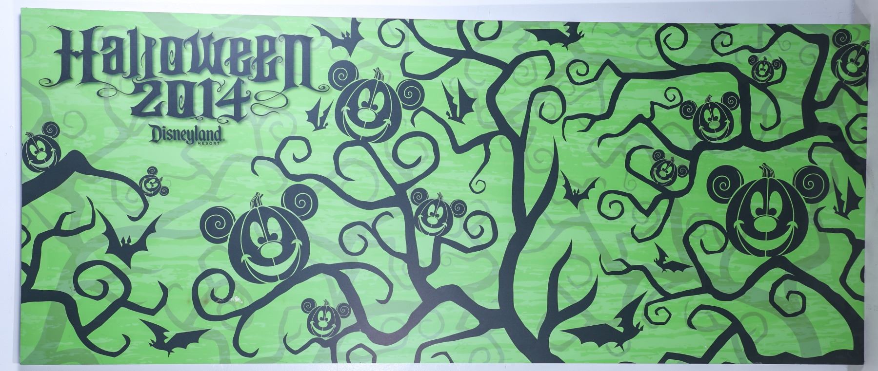 (Disneyland, c. 2014). A large Disneyland Halloween park prop sign from 2014. The sign is decorated with spooky trees that about a dozen Mickey Mouse jack-o'-lanterns sit on with bats flying in the air, all behind a ghostly green background. Measures approximately 69" x 28". The sign is in good condition with normal wear from age and park use. Item comes with a Grand Circle Tour Auctions COA.