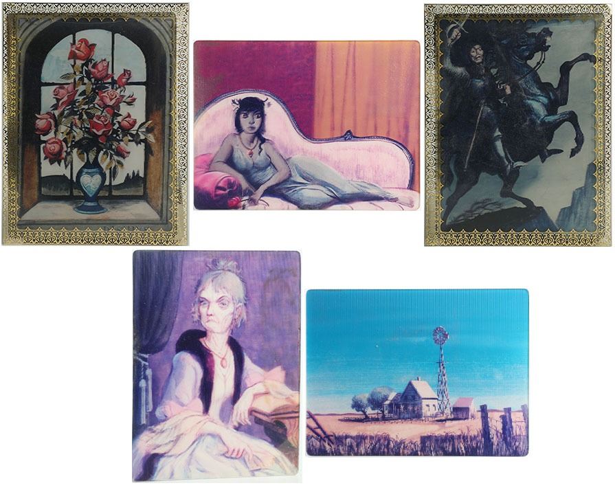 (Disneyland, New Orleans Square, The Haunted Mansion, c. 1999). A rare collection of Haunted Mansion lenticular cards including paintings of flowers, soldier on a horse, prairie home, old lady and cat woman. This group of cards includes the original series, plus some additional commemorative cards. These were sold during the 13th anniversary of the Haunted Mansion. The lenticular cards are in good condition with normal wear from age and minimal handling. Total of 9 cards.