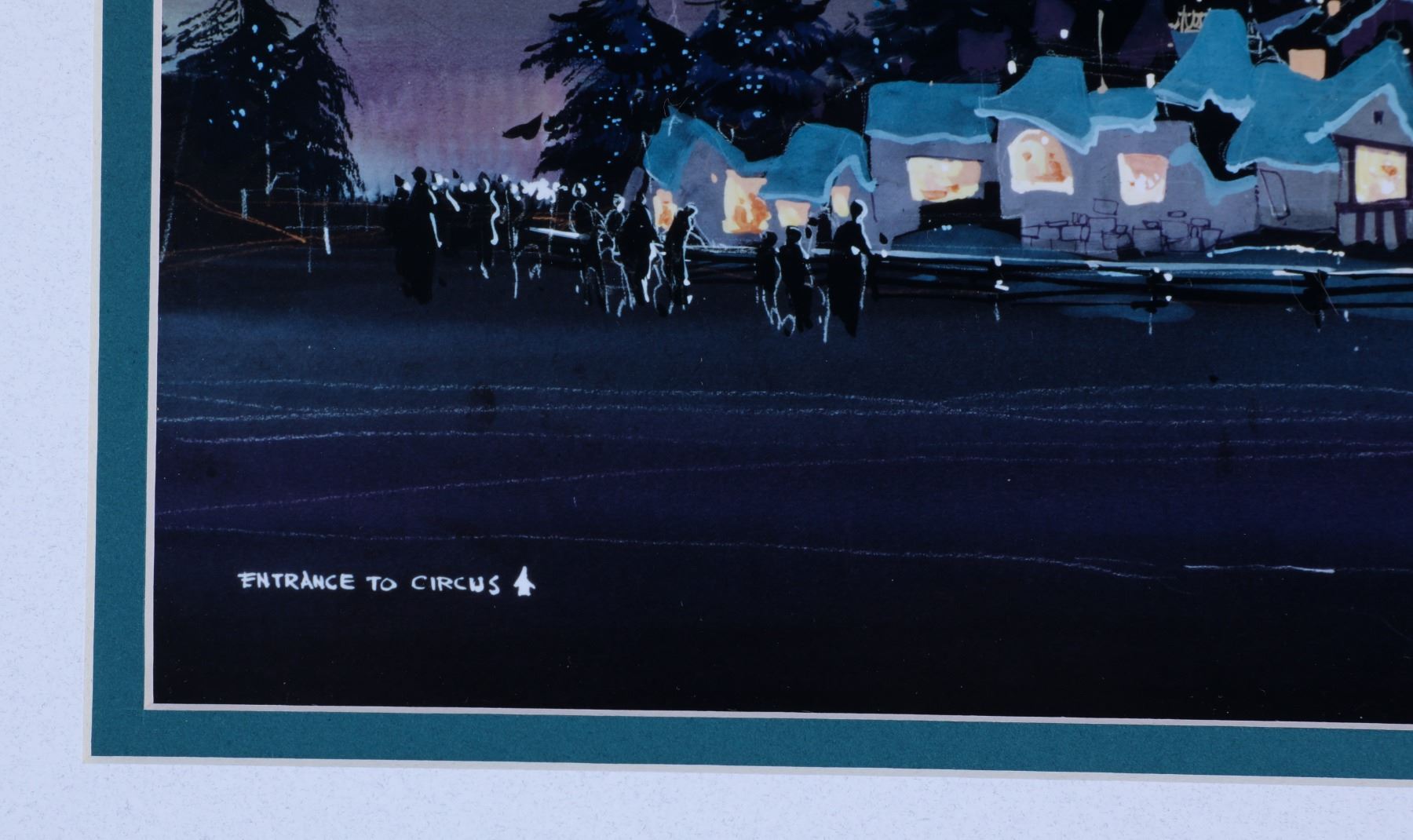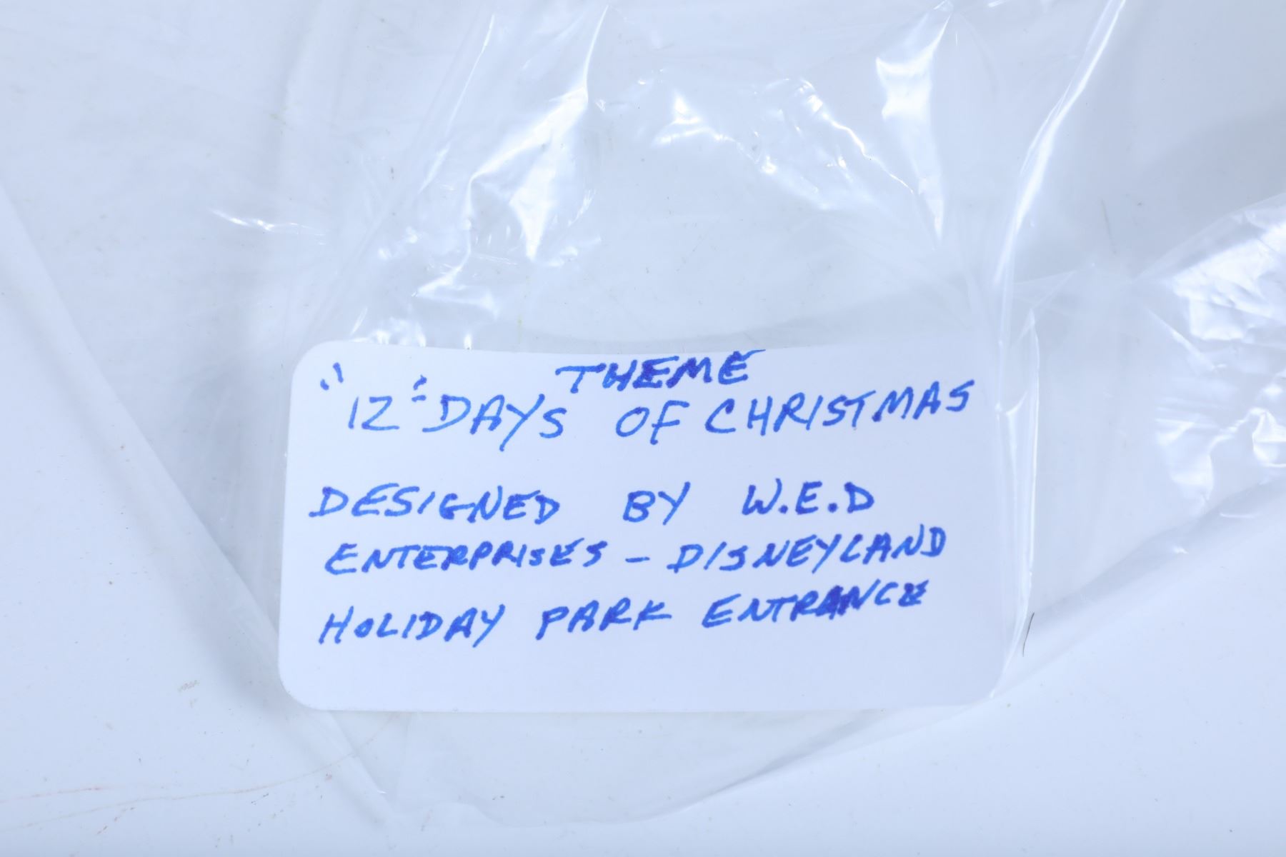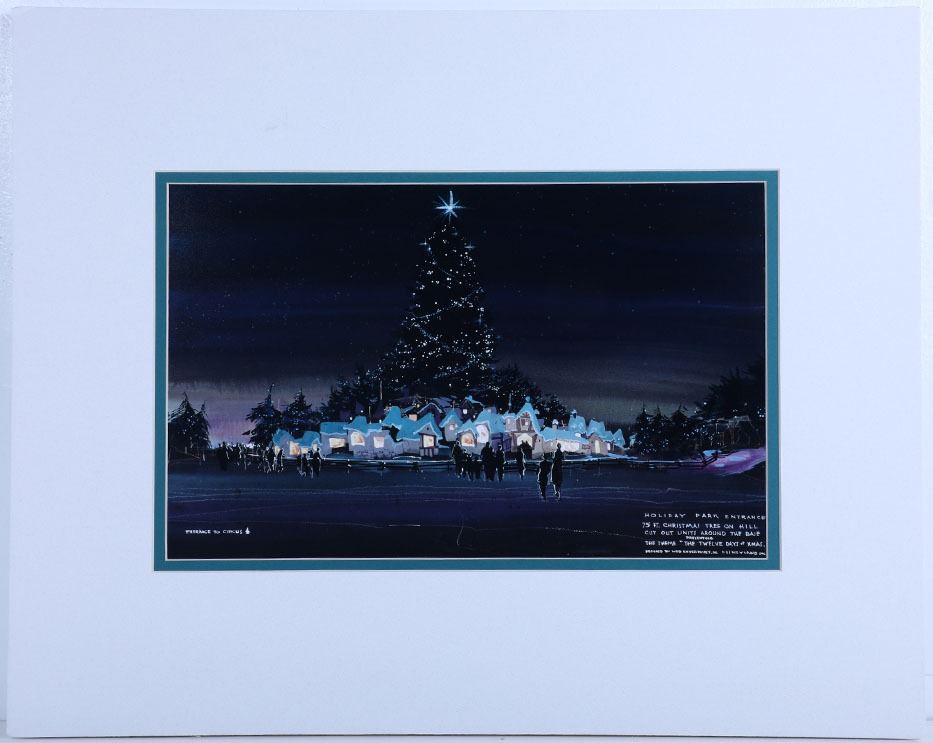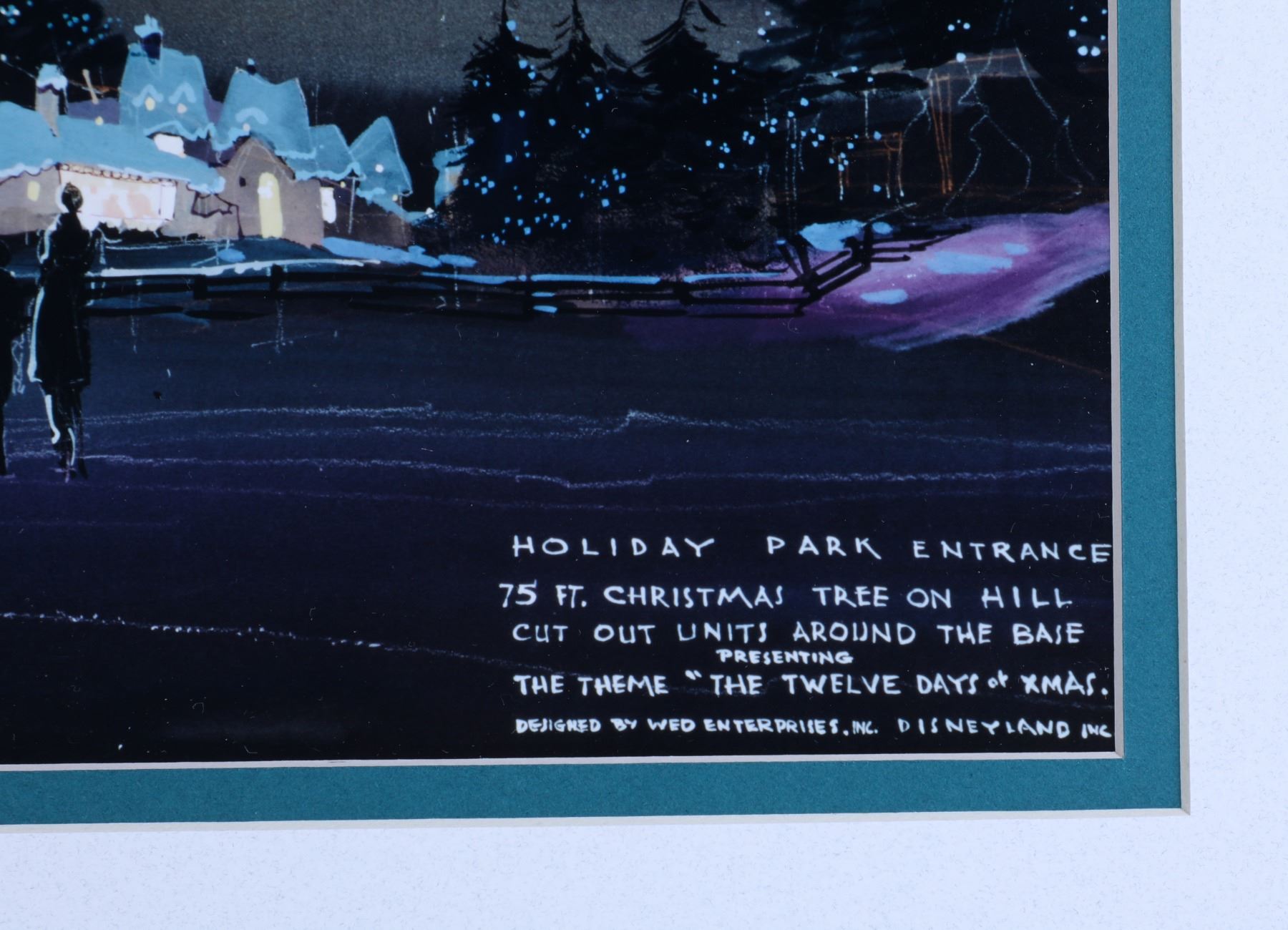 (Disneyland, Disney Gallery, c.1987-88). A very rare and early Disney Gallery print of concept art produced by Herb Ryman around 1955-56 for the Holidayland area that was created along the western edge of Disneyland. Because of this, Holidayland had its own entrance to Disneyland. Often referred to as the "lost" land of Disneyland, the area it once occupied is now New Orleans Square. Holidayland opened on June 16, 1957 and closed in September of 1961. This very rare print measures approximately 20" x 16" and is noted on the back as being themed to the '12 days of Christmas' and designed by W.E.D. The print is in good condition with normal wear from age and minimal handling. Item comes with a Grand Circle Tour Auctions COA.