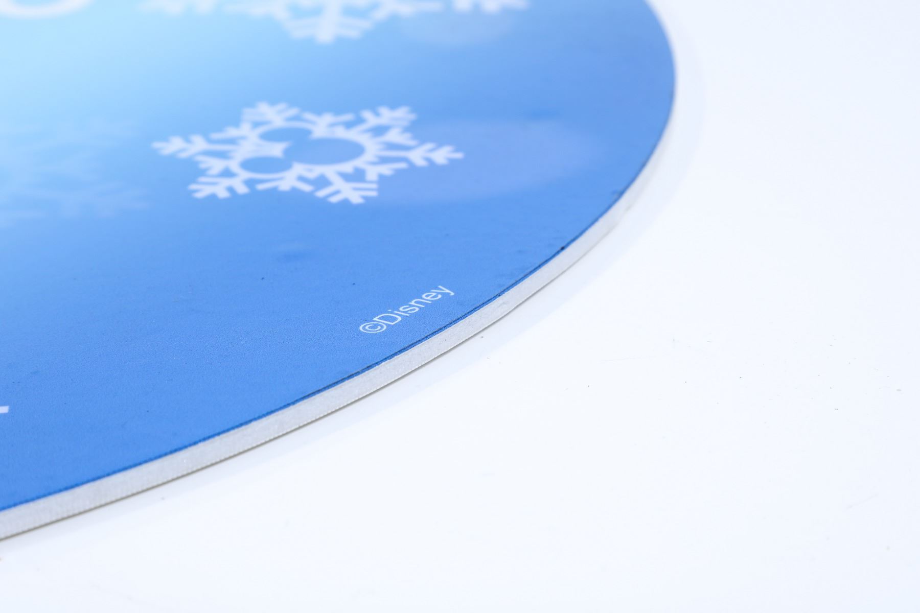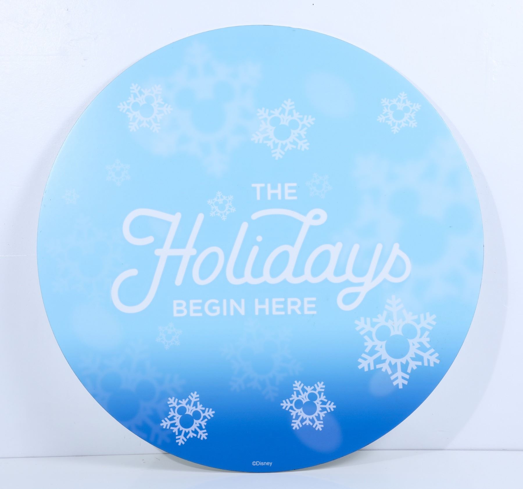 (Disneyland, c. 2010's). A Disneyland park used prop sign for the holiday season. The sign is decorated in a winter blue with snowflake Mickey Mouse heads displayed around the sign. The sign is in good condition with normal wear from age and park use. Measures approximately 24" in diameter. Item comes with a Grand Circle Tour Auctions COA.