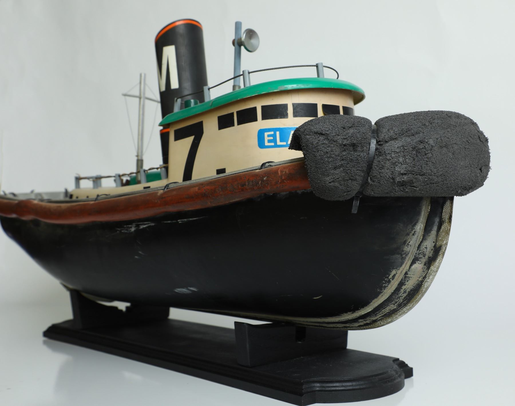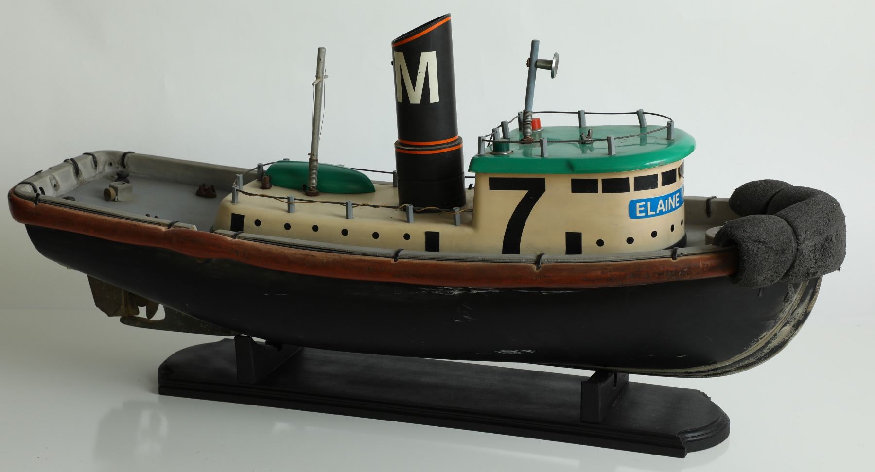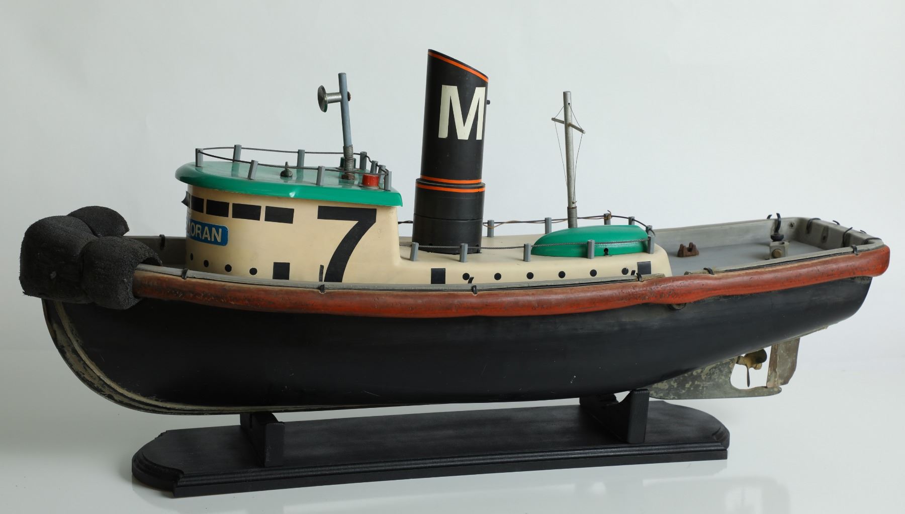 (Disneyland Hotel, c. 1984). Prior to the famous Jungle Cruise remote controlled boats were the Thola Productions Queen's Berth that featured 22 tugboats. The boats were themed to the Queen's Berth because at this time Jack Wrather still owned the Disneyland Hotel and the real Queen's Berth. Presented here is the often popular "Lucky #7" tugboat. The boat measures an impressive 34" x 16" x 11". The boat comes with a custom display and is in good condition with normal wear from use and age. Item comes with a Grand Circle Tour Auctions COA.