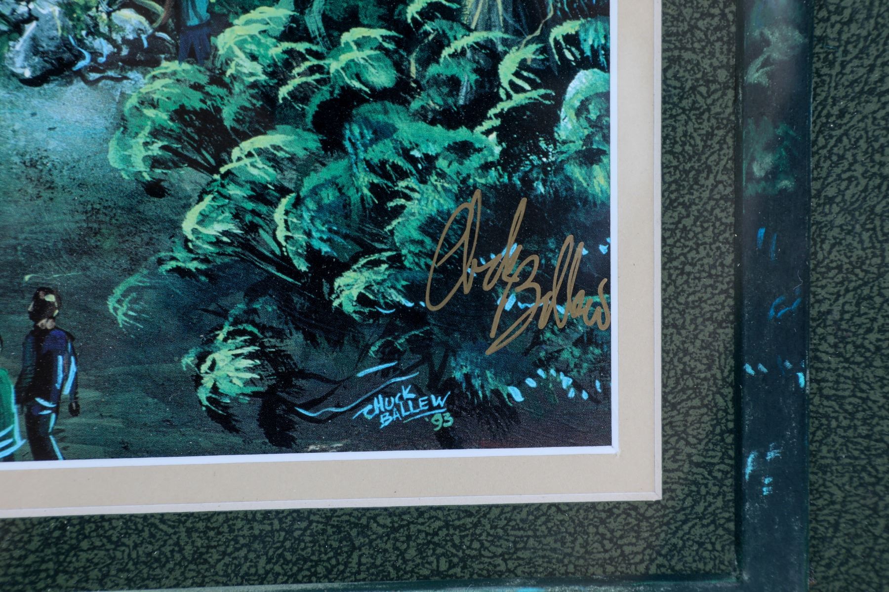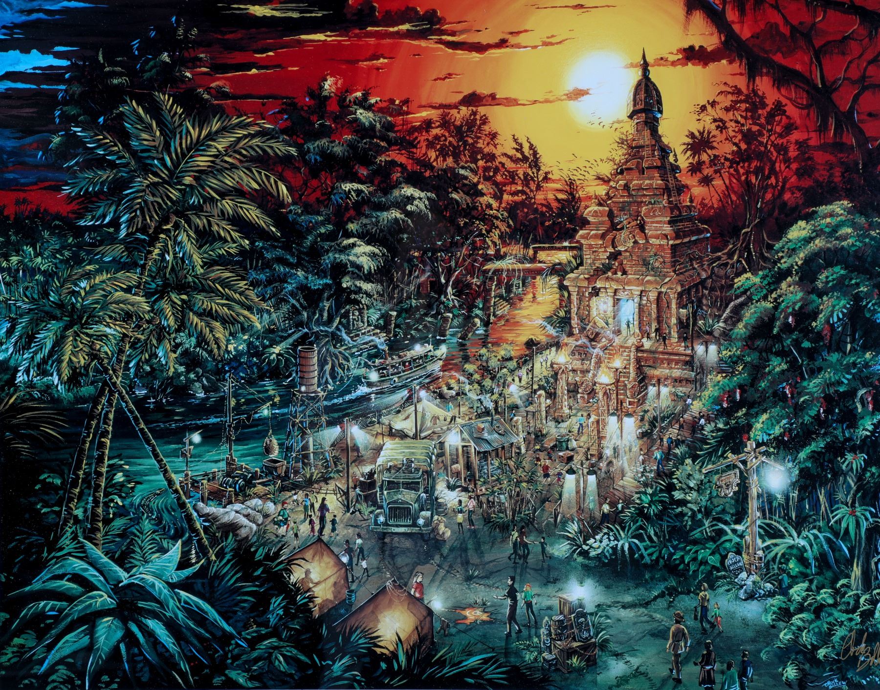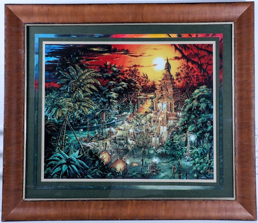 (Disneyland, Disney Gallery, c.1995). A rare Disney lithograph of concept art for temple design of the Indiana Jones Adventure attraction in Disneyland. With a printed signature and hand signed by artist Chuck Ballew and in a limited edition size. The item measures approximately 35" x 30" and is in good condition with normal wear from age and minimal handling. Item comes with a Grand Circle Tour Auctions COA.