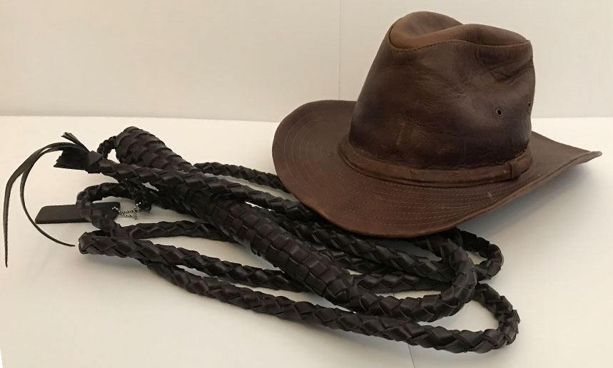 (Disneyland, c. 1990's-2000's). A rare leather version of the Indiana Jones fedora sold in Disneyland and accompanied with a Disneyland Indiana Jones whip. These items were originally sold in the Indiana Jones Adventure Outpost that was directly across the way from the Indiana Jones Adventure attraction. The Outpost was closed in 2017 to make way for extra indoor seating for the Bengal Barbecue The leather hat is in good condition with normal wear from age and use. The whip is in good condition with normal wear from age and minimal handling. Item comes with a Grand Circle Tour Auctions COA.