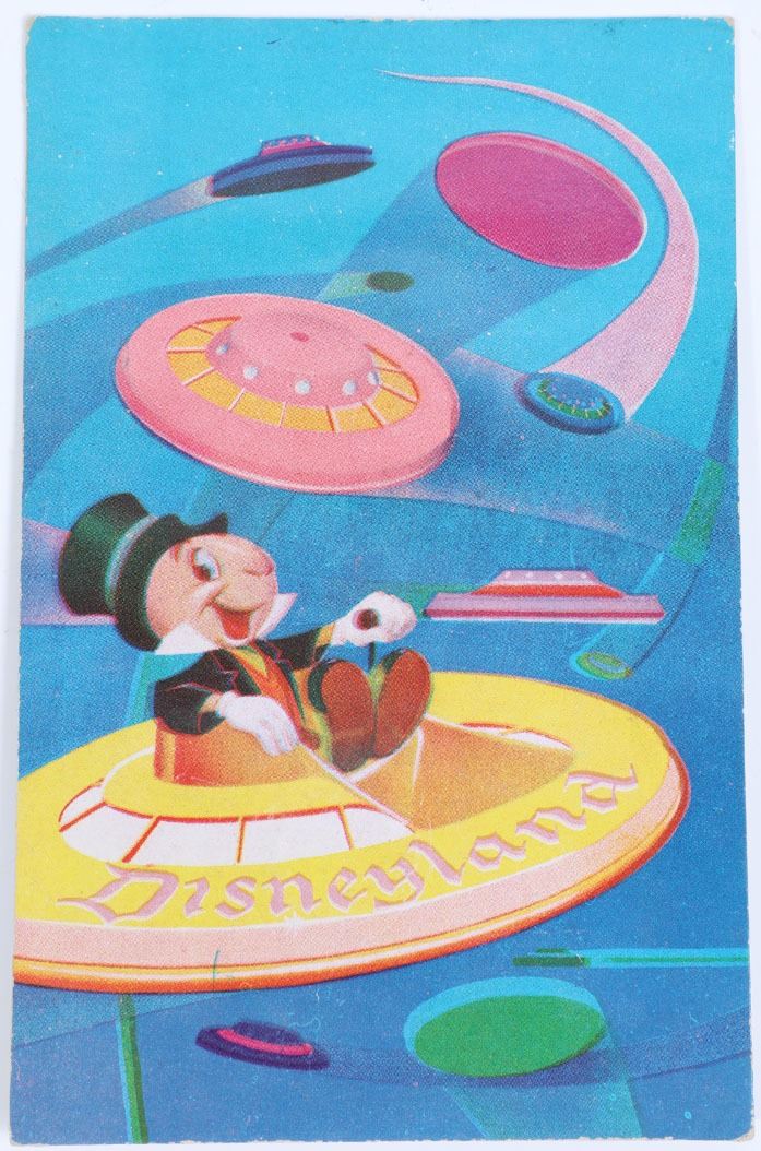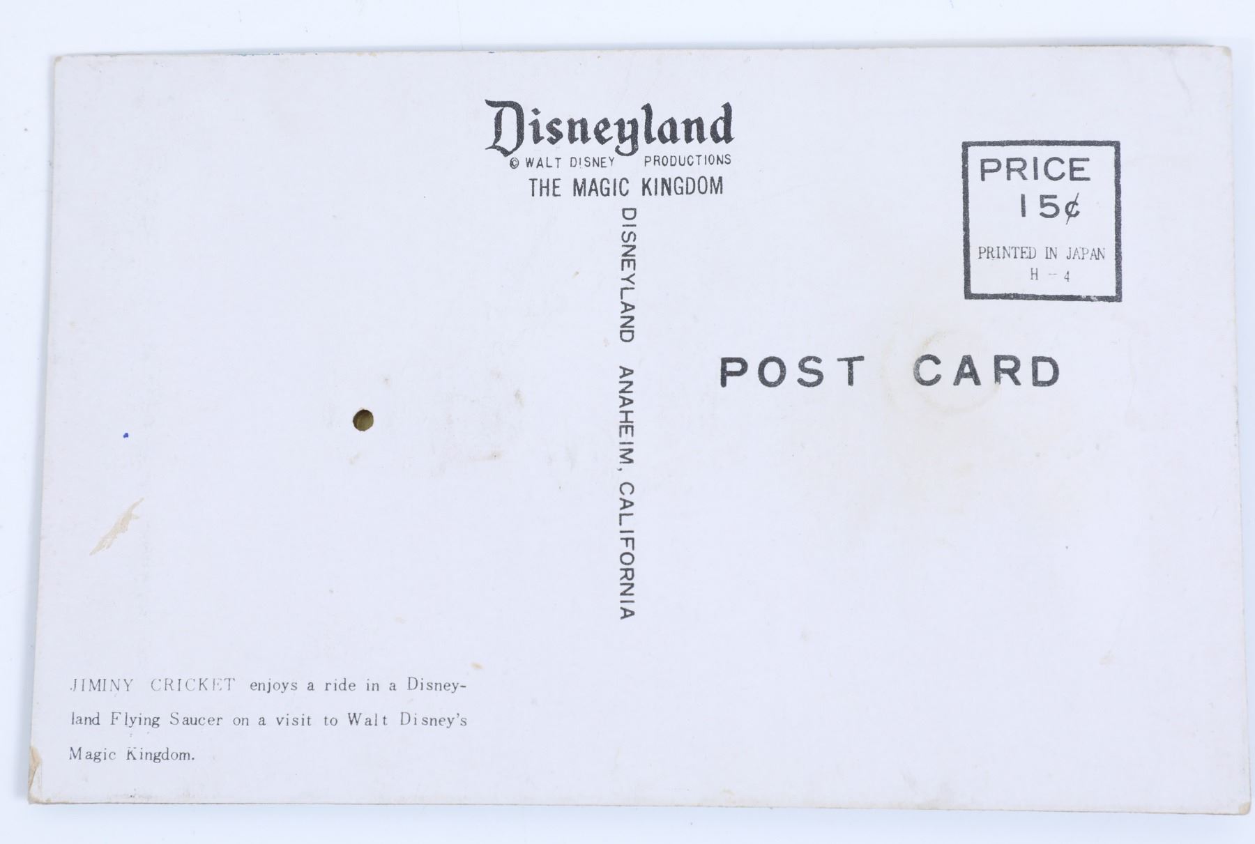 (Disneyland, Main Street U.S.A., c. 1960's). A rare, unused vintage Disneyland Jiminy Cricket on the Tomorrowland Flying Saucers postcard. The postcard is in good condition with normal wear from age and handling, including some minor edge wear. Item comes with a Grand Circle Tour Auctions COA.