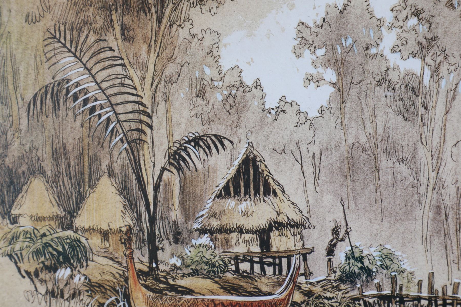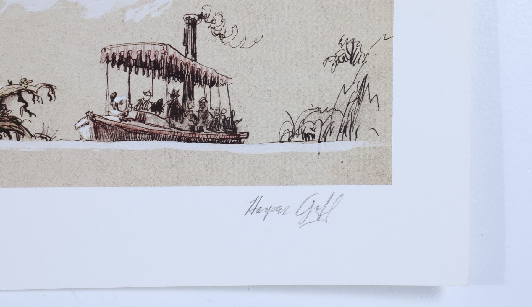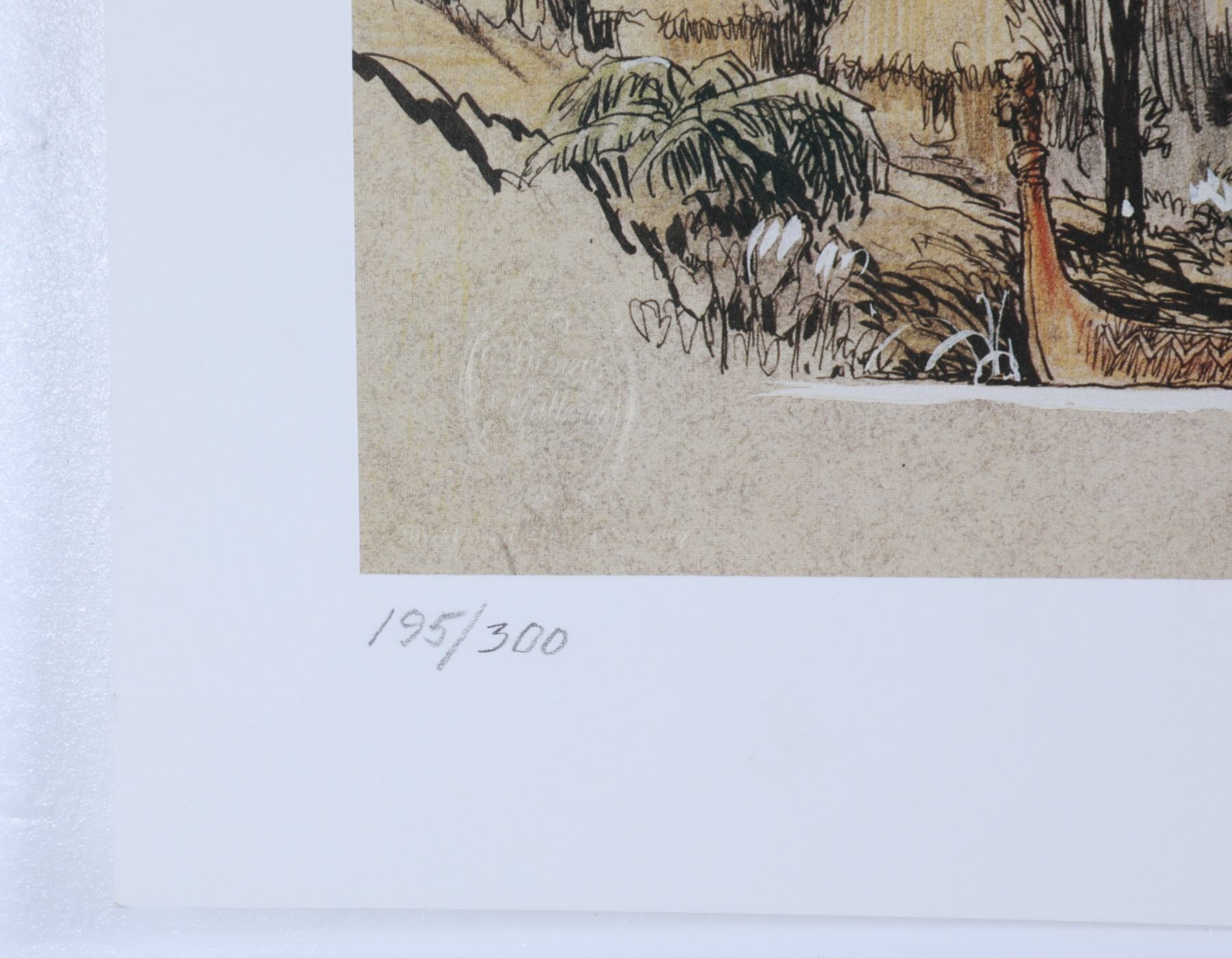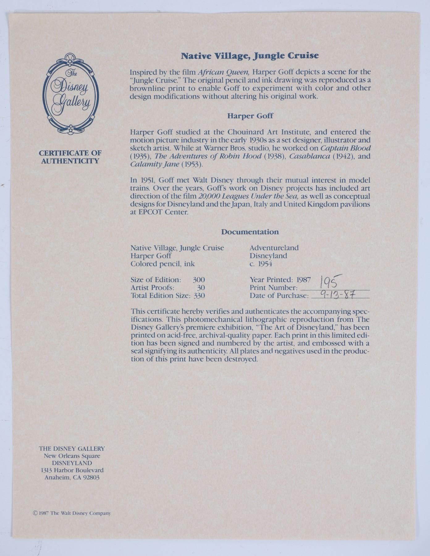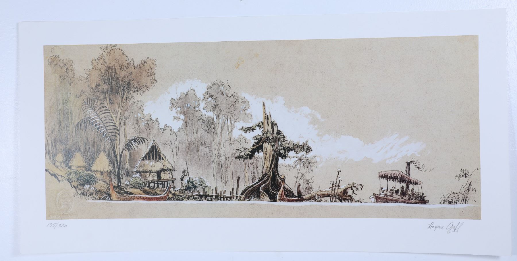(Disneyland, 1987) This unique and exquisite artwork was one of the first pieces ever sold at the Disneyland Gallery in 1987 - the first year the Gallery opened in Disneyland. A beautiful limited edition print featuring Hollywood production designer and Disney Legend Harper Goff's concept art for a scene in the "Jungle Cruise" attraction. The original artwork for this limited edition was inspired by the Hepburn/Bogart film "The African Queen" when Goff sketched it in 1954. Faithfully recreated for this limited edition release in 1987 and named "Native Village, Jungle Cruise". This hand-numbered 195/300 is signed by Harper Goff in the lower-right corner. Measures 29" by 14". This is an extraordinary piece of Disneyland History and an extremely rare piece being signed by one of Walt Disney's first Imagineers who was among the very few to work on concept art as well as the construction of the park itself. It was Harper Goff who originally walked the ground of Anaheim marking with a stick the path that the Jungle Cruise boats would eventually take. The artwork remains in good condition with normal wear from age and minimal handling and includes the original 1987 Certificate of Authenticity from the Disneyland Gallery. Harper Goff passed in 1993 in Palm Springs, CA. Item comes with a Grand Circle Tour Auctions COA.